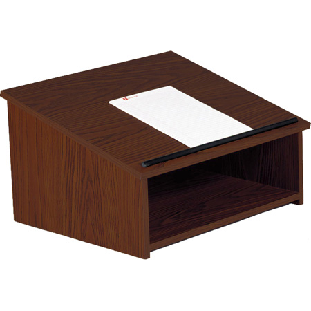The Oklahoma Sound 22 Series Tabletop lectern functions great on its own or in conjunction with the #112 floor lectern base (sold separately). Its 3/4" thick structure is comprised of stain and scratch-resistant thermofused melamine laminate secured to a particleboard core. The #22 also features a convenient paper/book stop below its ample reading surface.