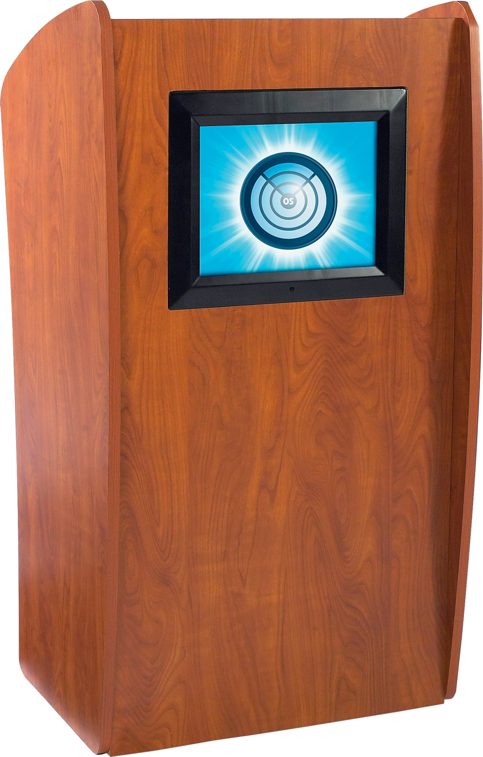 Finally! OSC has introduced the perfect lectern solution for customizing logos for your institution or presentation slideshows. Designed with a new sleek curved shape in a modern cherry laminate, which provides a contemporary look for a variety of venues, The Vision is furnished with breakthrough technology; a 15-inch LCD screen built into the front of the unit. The screen has the ability to display images uploaded with a SD-card or flash drive. It includes a remote control, allowing the presenter to switch to various preloaded images with a touch of a button during a presentation or between speeches.