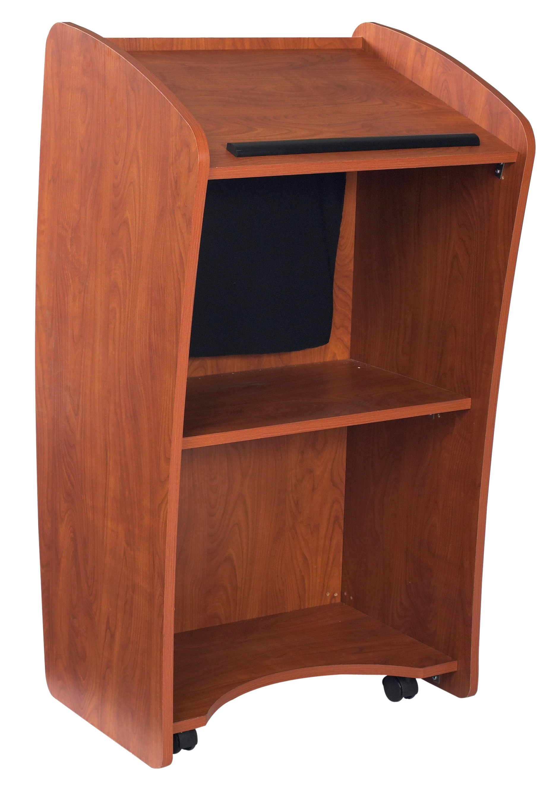 This integrated system can be used to display customized logos for schools, hotels or places of worship. Additionally, it enables a speaker to bring a presentation to life by displaying diagrams and photos for the audience. This beautifully hand crafted lectern is built with a3/4-inch stain and scratch resistant thermofused melamine laminateon MDF, and is available in a wood grain cherry color. The unit is equipped with two shelves for ample storage. Moves easily with four concealed casters, two locking. Assembly required.