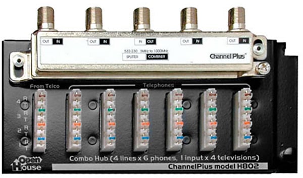 The Model H802 Combination Telephone/TV Hub provides a grid mounted solution for distribution of telephone and television. Four telephone lines can be distributed to six locations. CATV or antenna signals can be routed to four locations with the high quality on-board splitter.