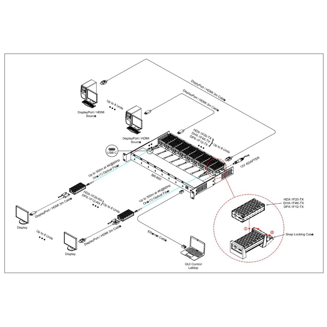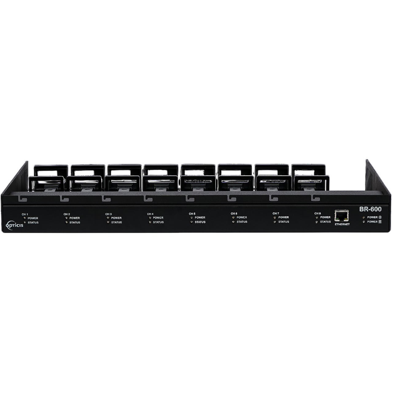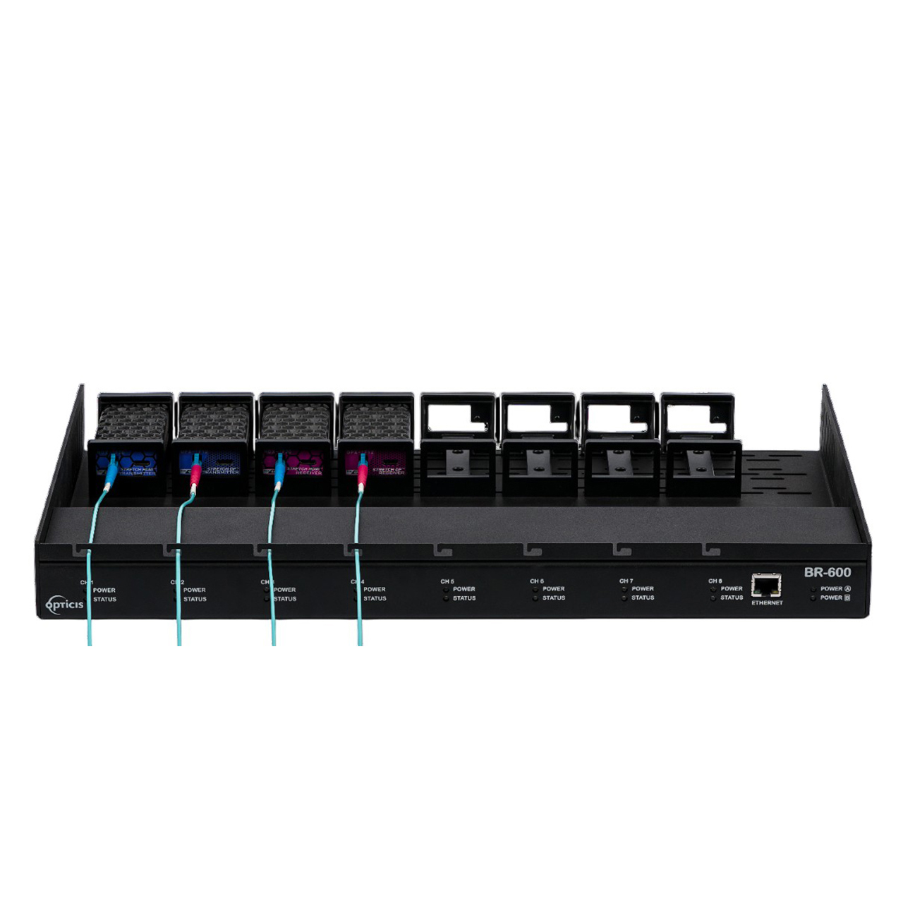 The Opticis BR-600 is a 19" 1RU Multi-Mounting Rack, that offers a modular, high-performance fiber-optic solution supporting up to 8 Opticis optical extenders. It supports Opticis diagnosis extenders HDX-1F20-TR, DPX-1F12-TR, and DHX-1F4K-TR, ensuring broad compatibility for different extension needs. The BR-600 is equipped with dual DC locking and Phoenix connectors for redundant power supplies, minimizing downtime. With Opticis' Snap Lock system, it simplifies the secure attachment of extenders. With its integrated diagnosis feature and GUI support, users can easily monitor power status and manage extenders remotely, ensuring operational stability and control in diverse environments.