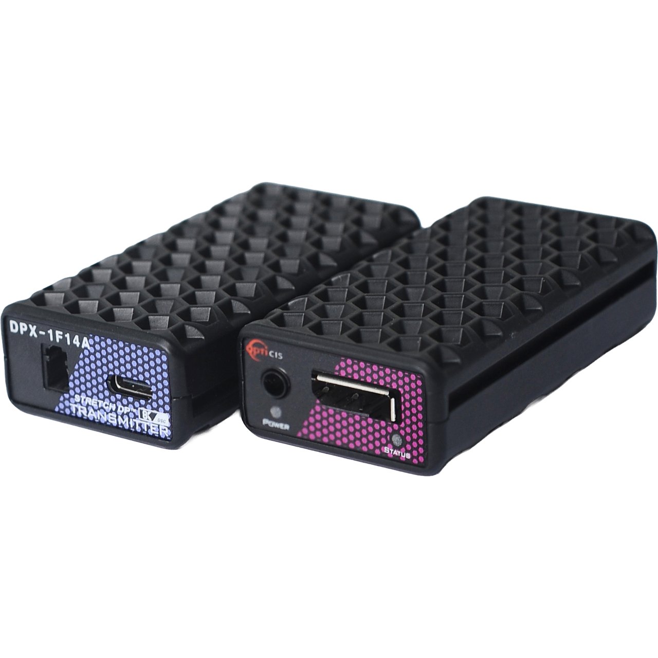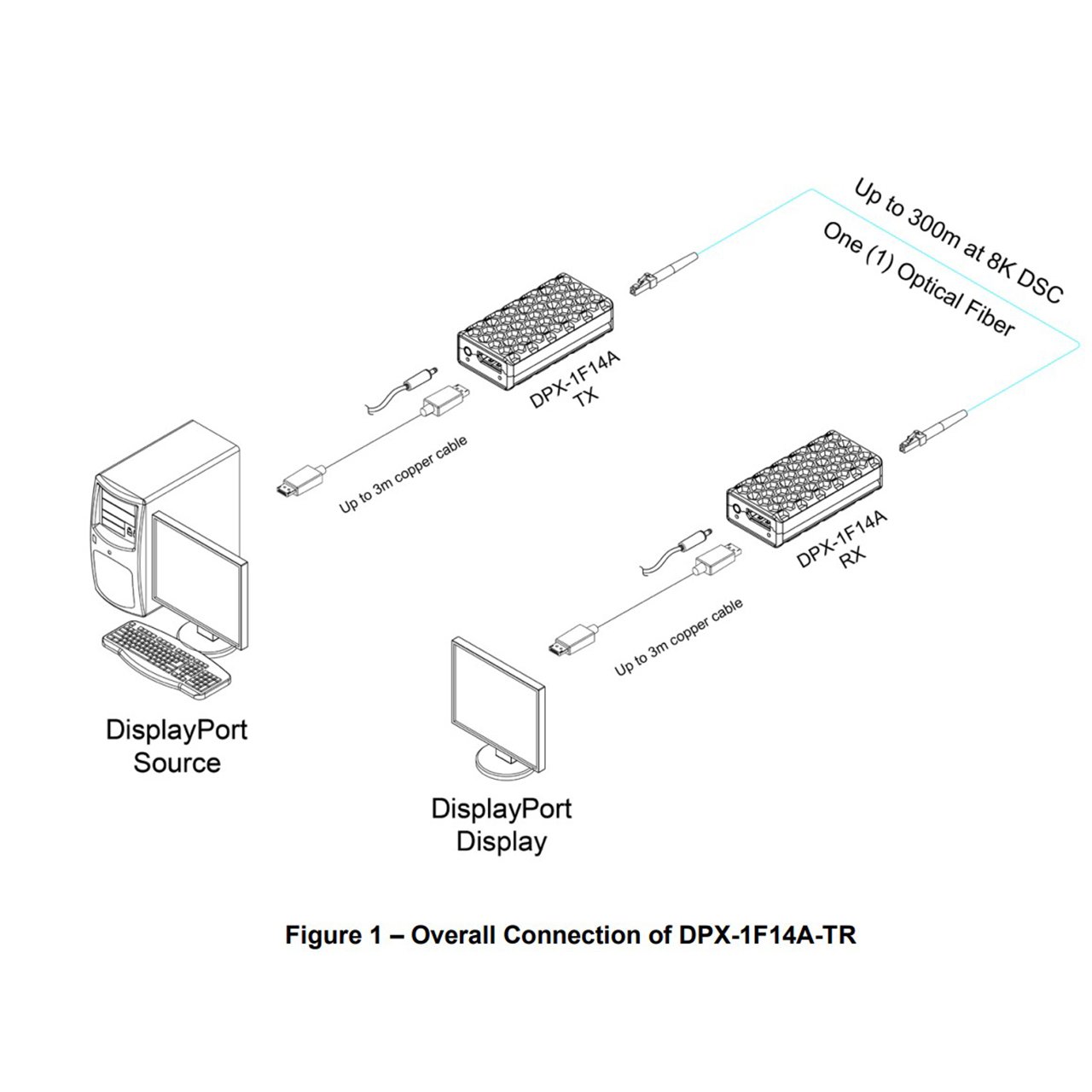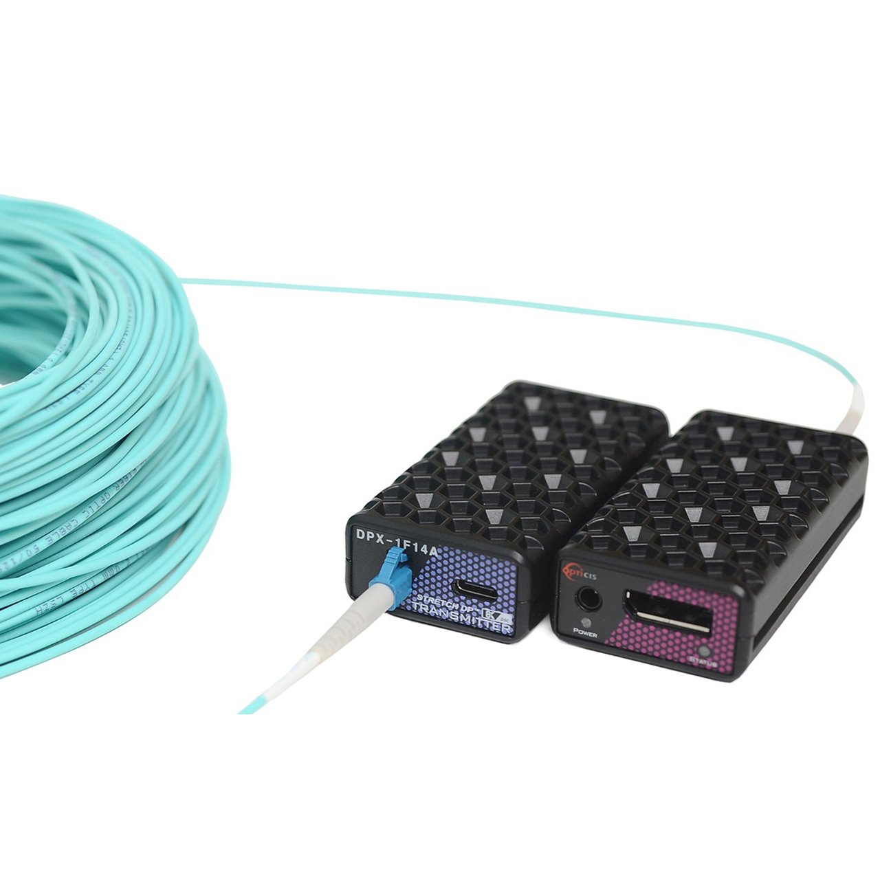 DisplayPort 1.4 one fiber optical detachable extender with copper extension, DPX-1F14A-TR, extends DisplayPort 1.4 signal up to 300m (984ft) and transmits up to 8K (7680x4320) at 60Hz DSC over one LC multi-mode fiber (OM3). Cutting-edge technology of Opticis reduces limits in installation by providing an option for longer additional extension.