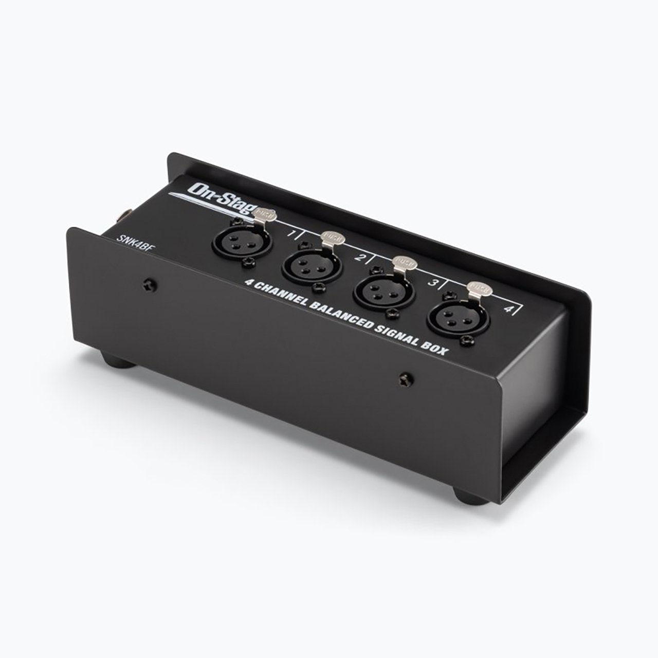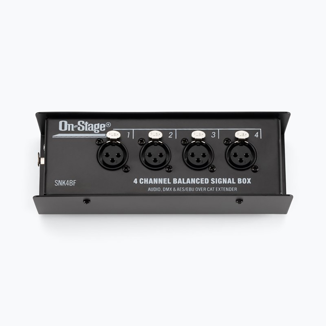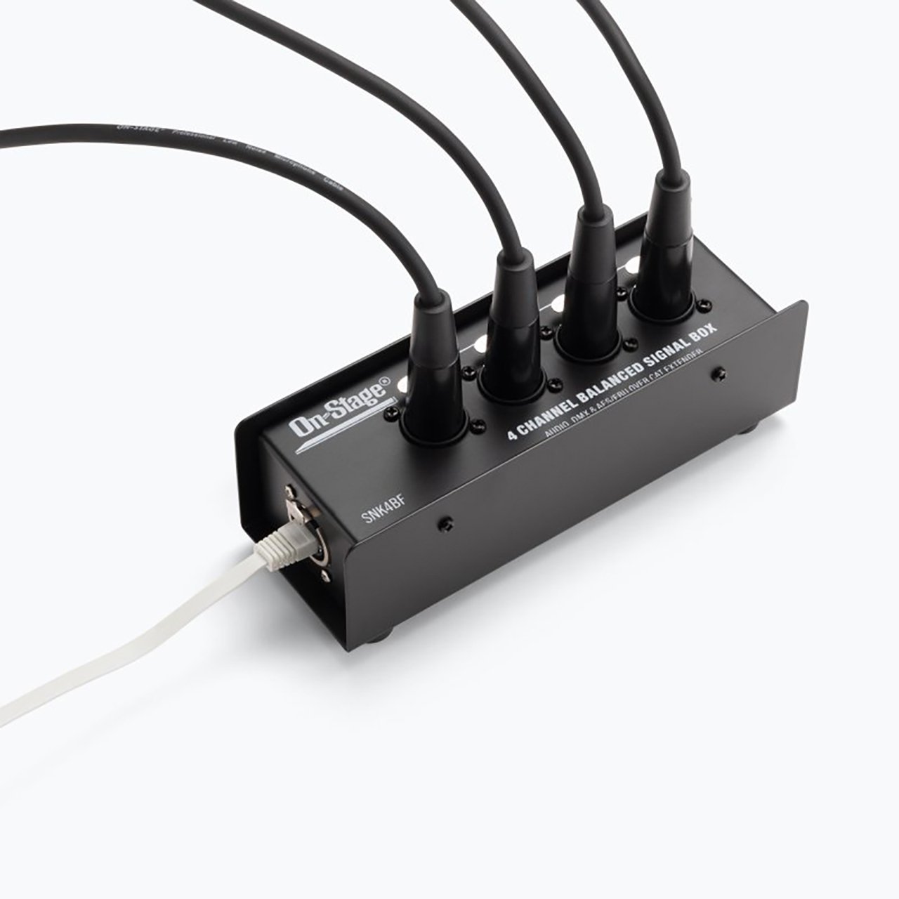The On-Stage Production-Grade SNK4BF Snake Box consolidates four XLR-female connections into a single ethernet cable. Supported signals include balanced-analog audio for microphones, instruments, and speakers as well as digital protocols such as DMX and AES/EBU for stage lighting and audio. This bidirectional device routes signals in either direction to suit a wide range of setups. The RJ45 connector accepts a shielded CAT 5, 5E, 6, 6A, or 7 cable, making it easy to protect signal integrity. It even passes phantom power for mics. With its passive circuit, flat frequency response, low THD, and low noise floor, this Snake Box provides clear, high-quality audio transmission.