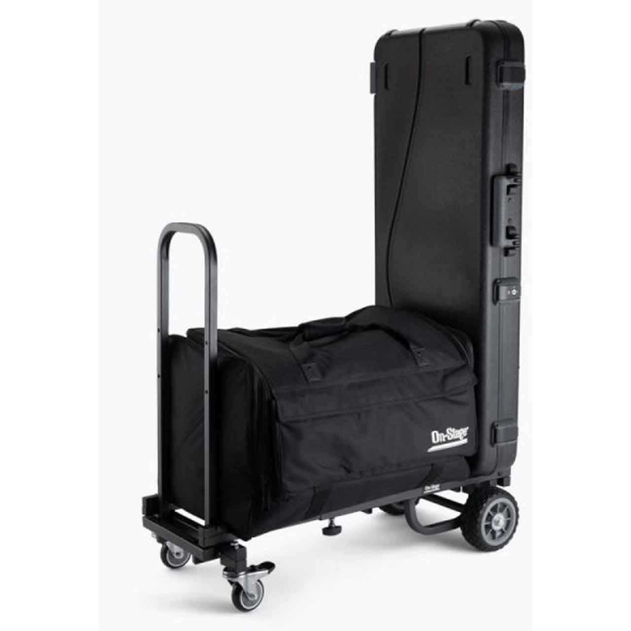 The On-Stage Stands rugged, agile UTC1100 Compact Utility Cart hauls 330 lb of gear in a single trip. The adaptable bed expands to make room for large loads and it contracts to negotiate tight spaces. Ergonomically positioned handles at each end facilitate comfortable pushing, pulling, and steering by one person or multiple people and the handles can lie flat against the bed to clear the way for oversized gear. Safety features include locking casters that keep the cart from rolling during loading and unloading as well as anchor points on the frame for straps to secure equipment. For efficient storage and transportation, the bed contracts and the handles fold down.