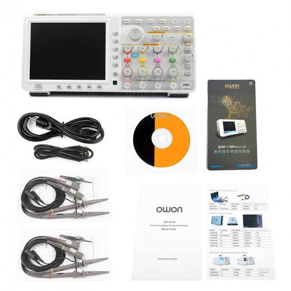 The OWON TDS7074 features a Max 200MHz bandwidth, up to 2GS/s realtime sample rate. 7.6M record length. 50,000 wfms/s waveform capture rate. Waveform zooming (horizontal / vertical), and saving. FFT points (length, and resolution variable). Multi-window extension. User-friendly voice warning. 8 inch 800 x 600 pixels high def LCD. Multi- communication interface : USB, VGA, LAN