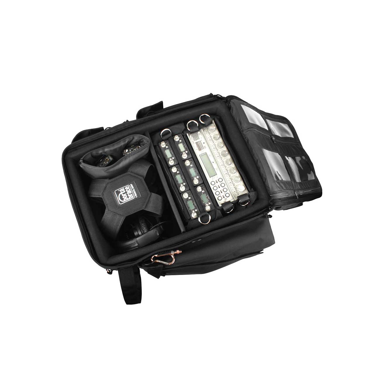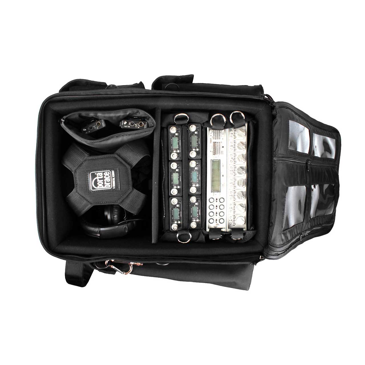 The BK-2AUD has a lightweight, padded rigid frame and a comfortable strap system with thick padding and breathable mesh lining to maximize air-flow.The case has a padded pocket that will hold a 17" laptop computer and 2 accessory pockets perfect for spare batteries and cables. It includes a 6" x 9" padded accessory pouch, a set of 6" Piggin' Strings, and a strong rigid divder for extra support of heavy audio equipment. The backpack has extra foam padding and non-slip material on the shoulder, removable waist straps, and padded side support straps. A LI-GLW illumination strip light pocket is included.