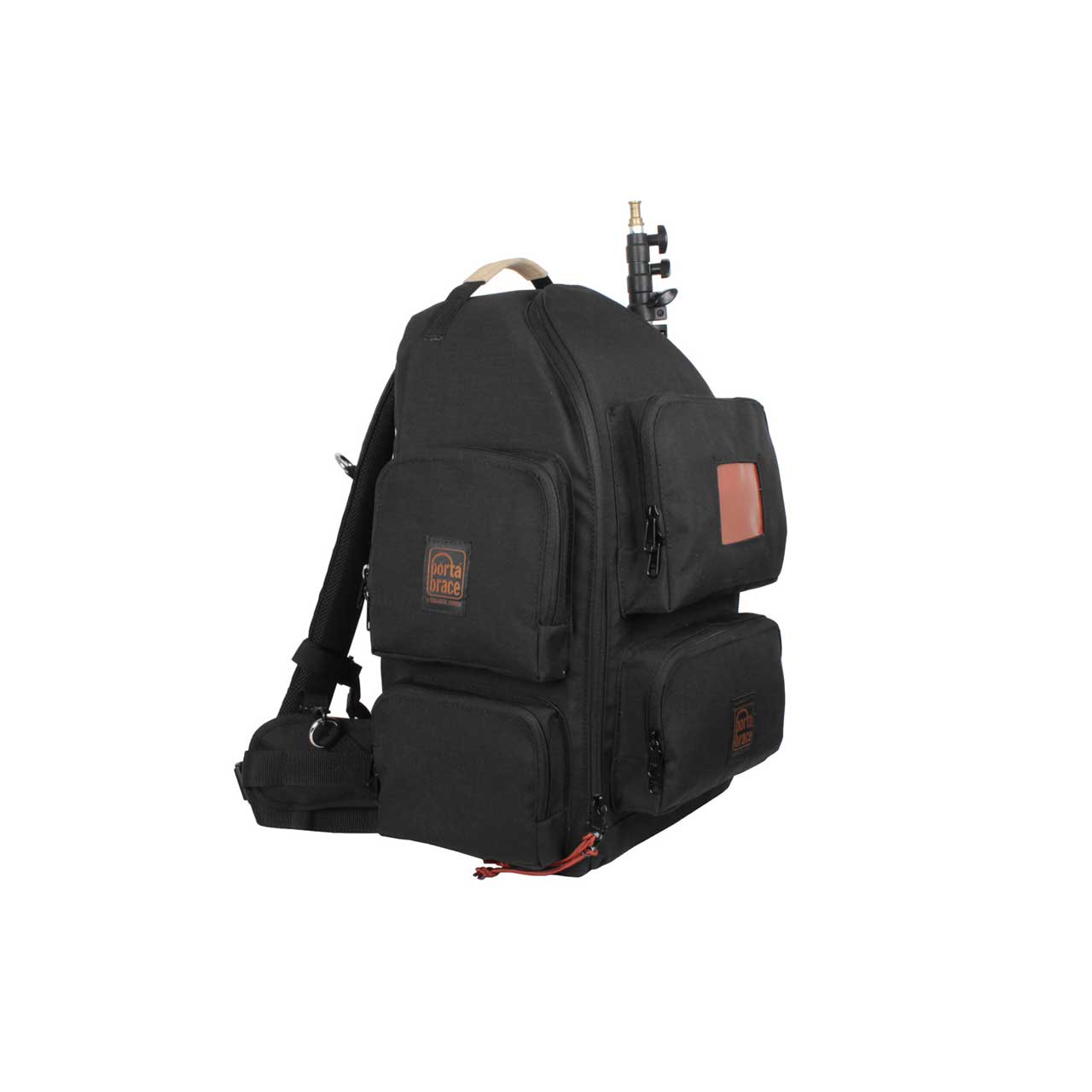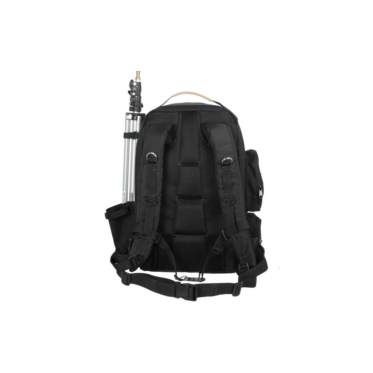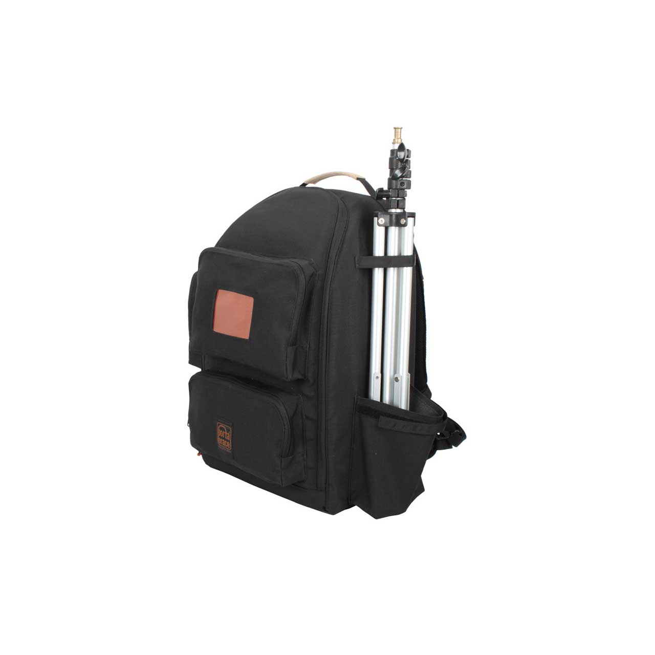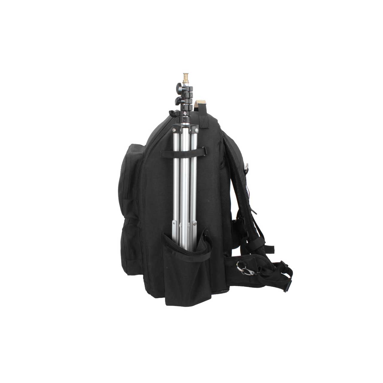 The BK-5HDV strap system allows you to use the comfortable backpack straps or single-strap "slinger" format. The straps have thick padding and are lined with soft mesh material to maximize air-flow between the backpack and your body. The backpack straps tuck away when not in use. There is a side pouch that carries small tripods and 3 exterior pockets to hold additional accessories. There is also an interior pouch for a tablet computer (iPad compatible) with a clear vinyl cover so the tablet can be used while in the case.