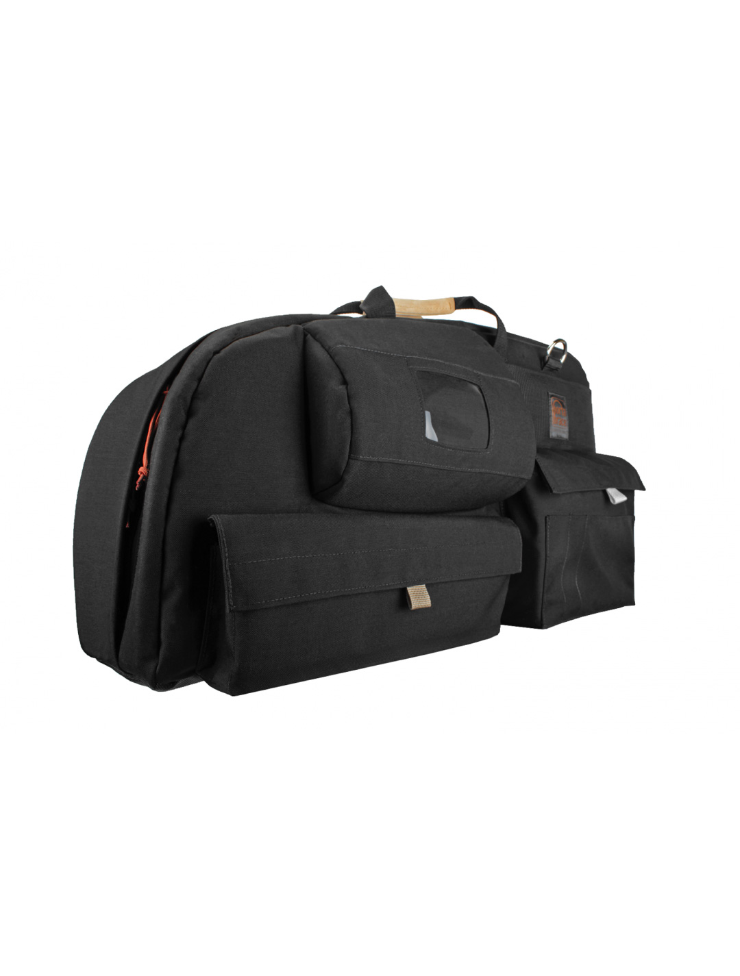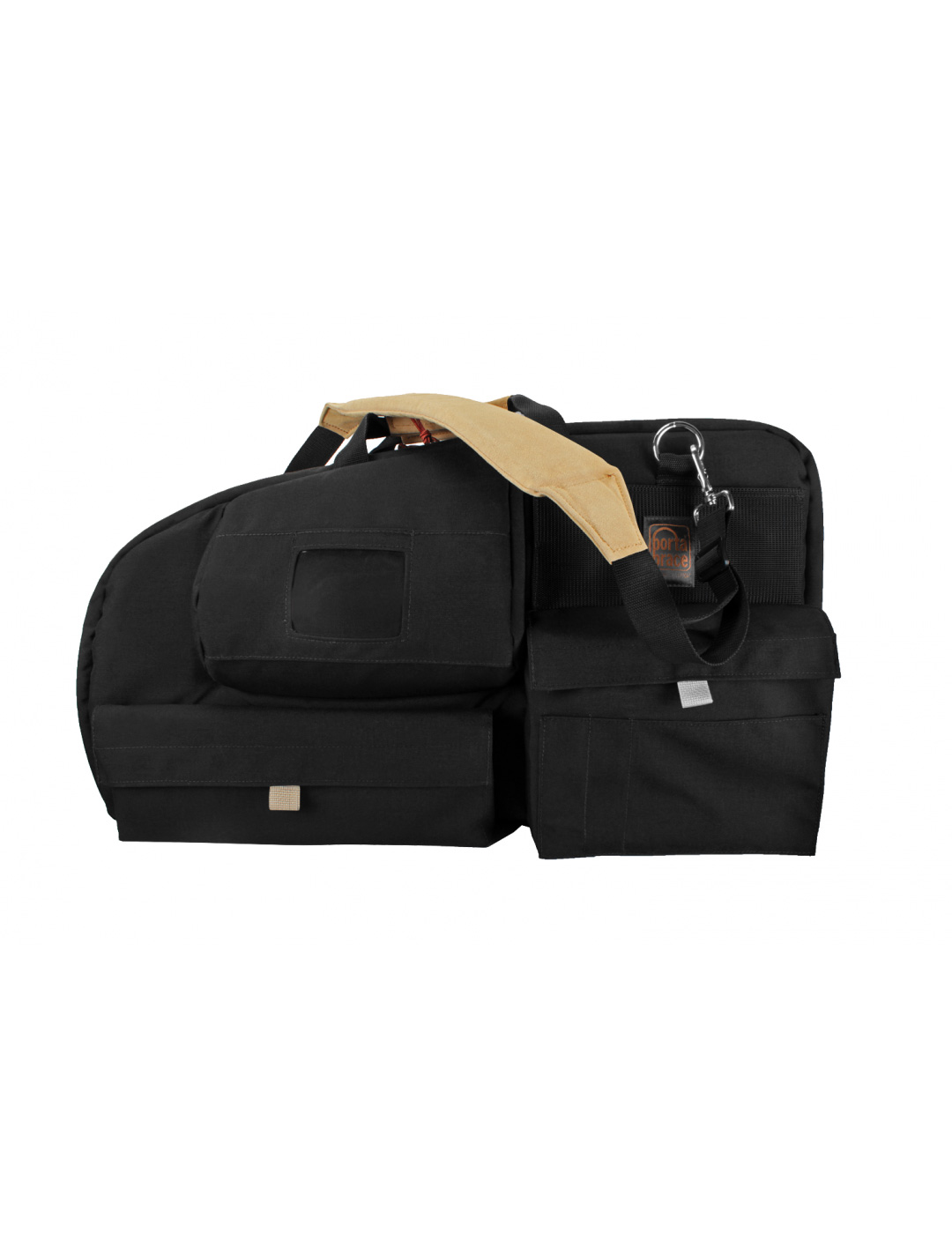 There is an oversized padded viewfinder protector to better accomodate side-mounts and brackets. An interior pillowing system provides superior cushioned-protection for the camera. Two large exterior pockets and one interior slip-pocket are perfect for storing accessories, white-balance cards, and your optional Portabrace Rain Slicker. Colored tabs on pocket flaps help identify contents for convenience. Two exterior mesh slip-pockets hold tickets, maps and passport. There's also a seat-belt retainer strap to stabilize your equipment on the road.