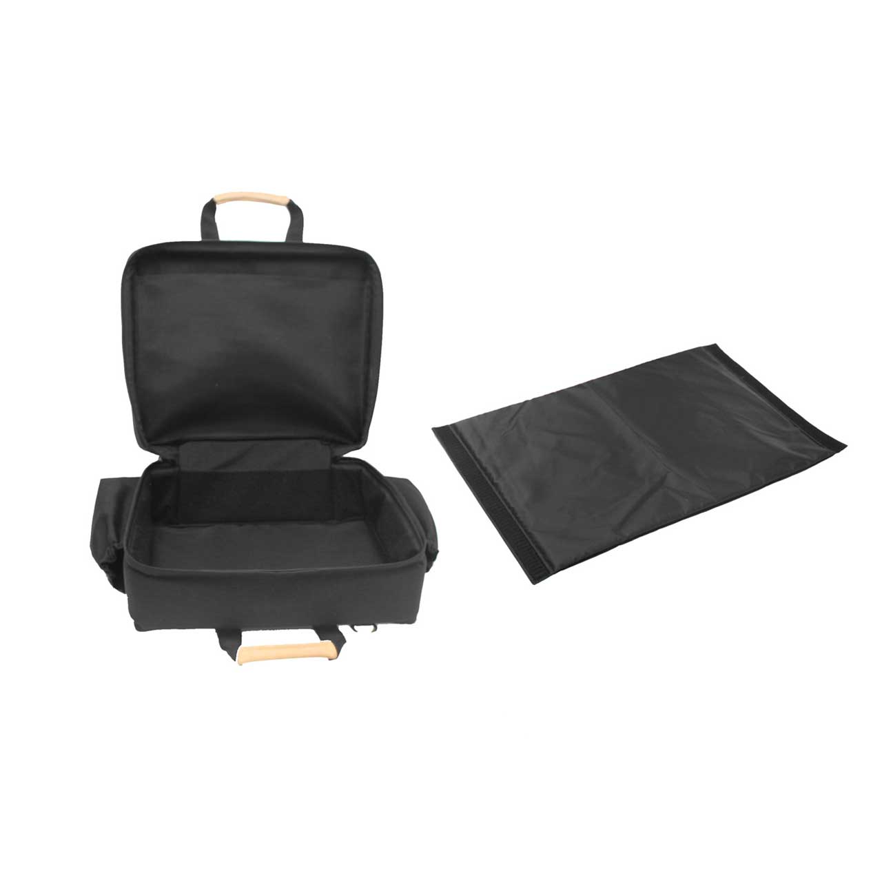 The LPB-LED2 Light Pack Carrying Case for Multiple Lite Panels 1X1 (Midnight Black) is made of water resistant 1000 denier Cordura nylon with closed-cell foam padded interior and thick U-shaped foam at the bottom. There is a removable interior divider. The top-loading zipper design gives quick access to the panels. The case has an external pocket for cables and batteries, a soft, padded pouch for carrying gels and 2 side exterior light stand pockets. It is carried by 2 handles with suede leather covered overlapping grips or an included shoulder strap with suede leather covered pad.