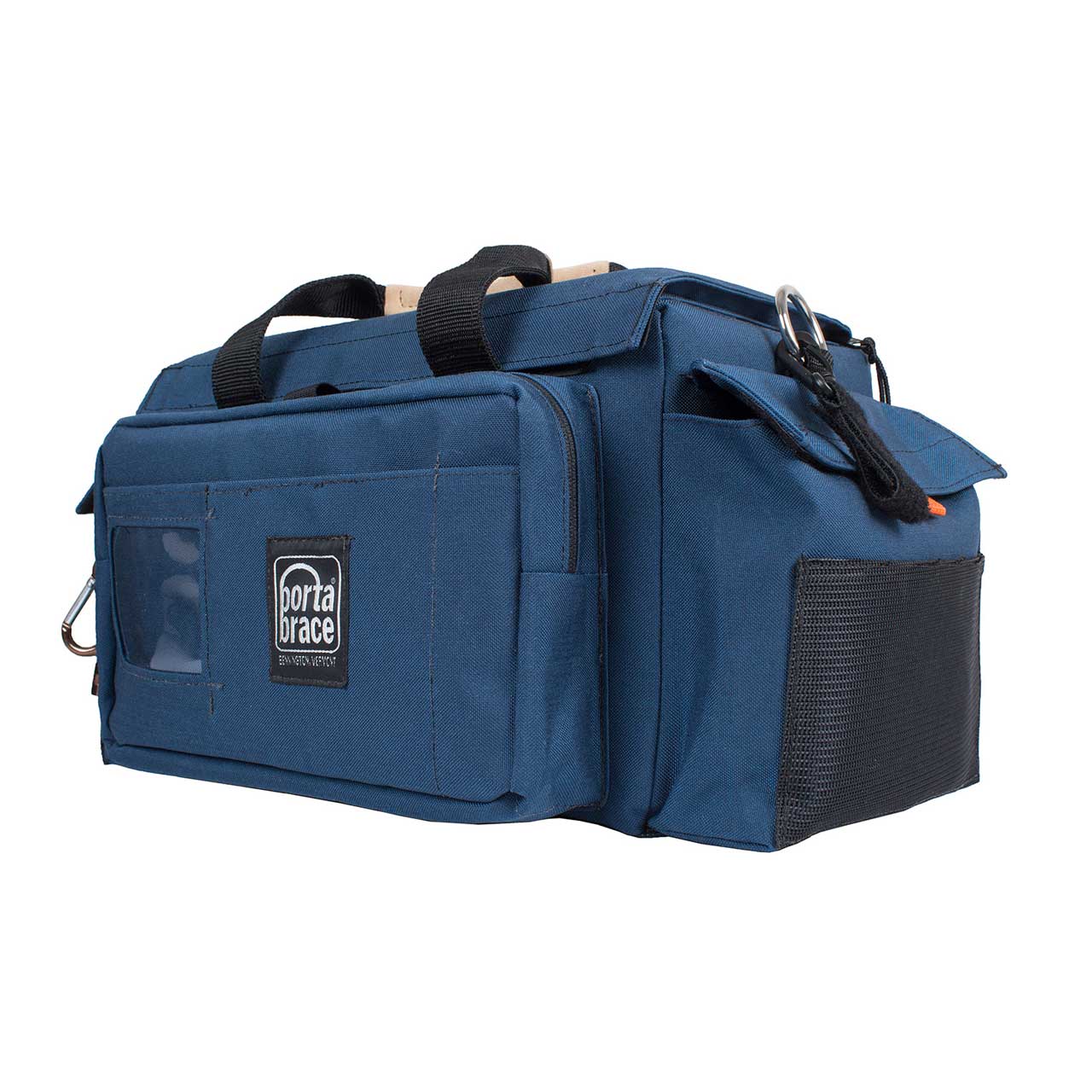 The medium-sized Portabrace PB-BSCC is shaped by a full width, rigid panel, between layers of Cordura Nylon and is crushproof. They have a bonded foam and plastic, lightweight rigid lid. This case is designed to hold the BlueShape 4 V-Mount Battery Station or the BlueShape 4-Channel Charging and Monitoring Utility. Mesh pockets in the lid provide convenient access to things often used. Two side pockets and a large mesh slip pocket provide room for extra gear. The PB-BSCCB comes with a comfortable HB-1040 suede shoulder strap.