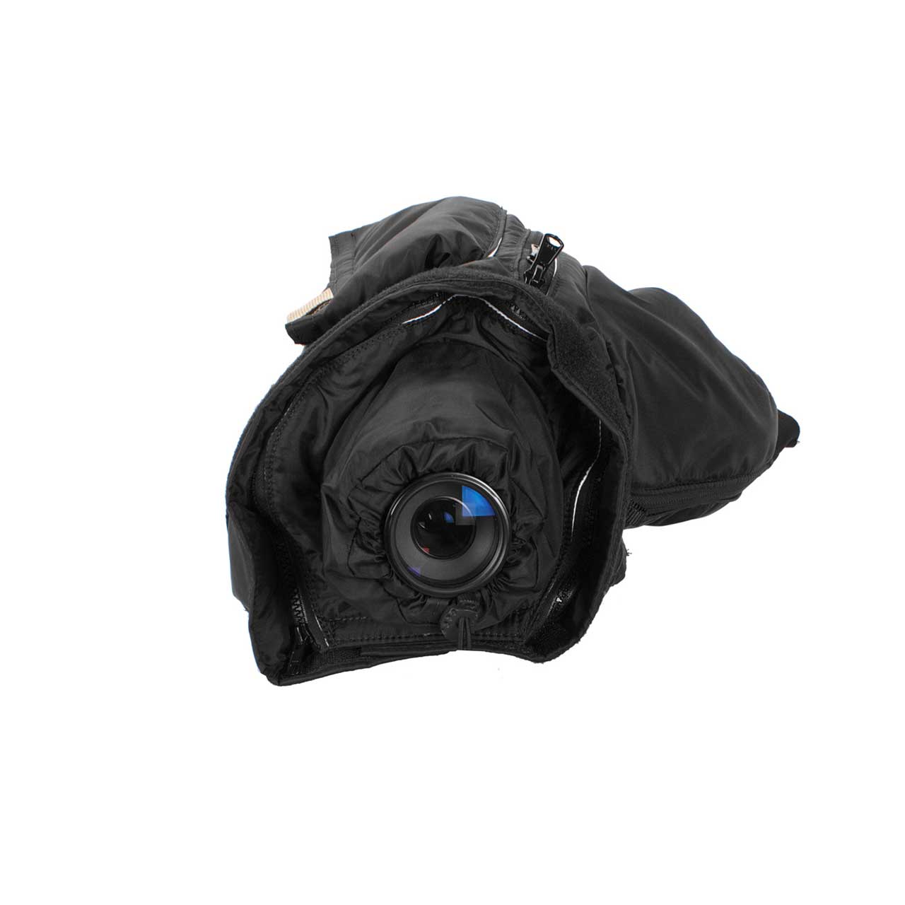 Two-hand openings at the lens and one by the viewfinder are enclosed with cotton cuffs that keep hands warm.