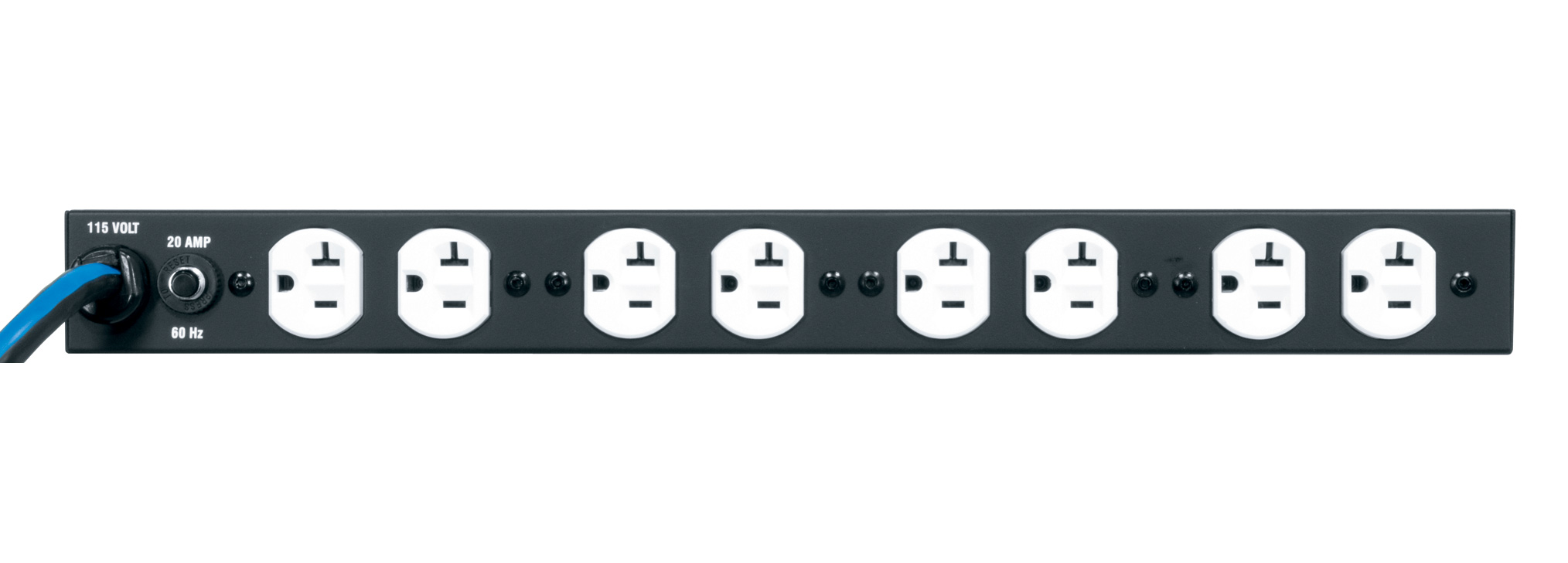 The PD-920R rackmount power distribution unit is equipped with 8 circuit breaker protected rear outlets (NEMA 5-20R), and one front outlet (NEMA 5-15R). Standard equipment includes surge and spike protection that utilize a clean line to neutral that does not pass noise contamination to ground (PD-920R-NS does not have this protection), EMI filtering, and a 9' cord. A generous 9" depth offers easy access to the 20 amp rear panel outlets, which are solidly mounted on yokes to eliminate deflection. An illuminated combination power switch/circuit breaker is located on the front panel. UL listed in the US and Canada. Occupies one rackspace. The PD-920RC-20 shares all of the same features as the PD-920R, but boasts a generous 20' cord.