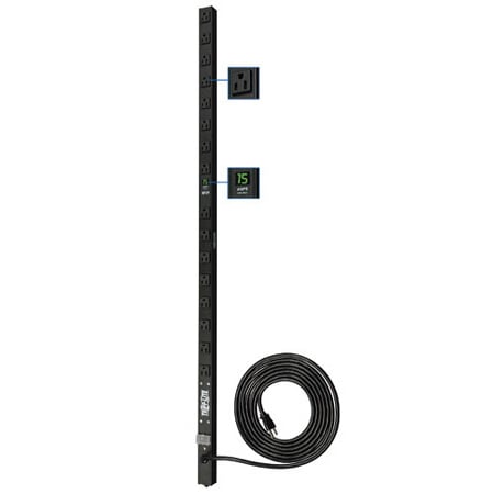 Tripp Lite's PDUMV15 metered power distribution unit offers 15 amp, 120V multi-outlet AC power distribution in a convenient 48-inch mountable housing. Digital current meter displays the power consumption of connected equipment. Offers vertical power distribution in rackmount, raceway, and workbench applications. Includes 16 NEMA 5-15R output receptacles, 15 ft. AC line cord, and lighted power switch with locking transparent cover to prevent accidental shutoff. Sturdy all-metal extruded aluminum housing stands up to demanding network, laboratory, or factory enviroments. Unfiltered electrical pass-through makes the PDUMV15 ideal for distributing alternate waveform UPS or generator power in rack enclosures, network closets and more. Included 16 NEMA5-15R outlets, 15-ft. AC power cord with 5-15P plug, 15 amp circuit breaker in rugged metal case design.