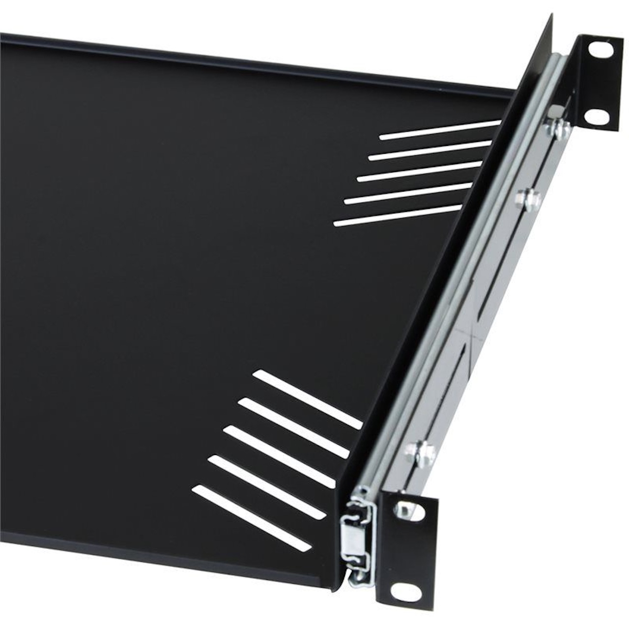 The Penn Elcom R1290/1U is a 380mm / 14.96" sliding rack tray with Universal Equipment Fixing Points. It feature a recommended load capacity of 41.89 lbs (19kg) and is available in a black powder coated or light grey finish (RAL7035). The shelf is constructed of 1.2mm / 18 gauge steel.