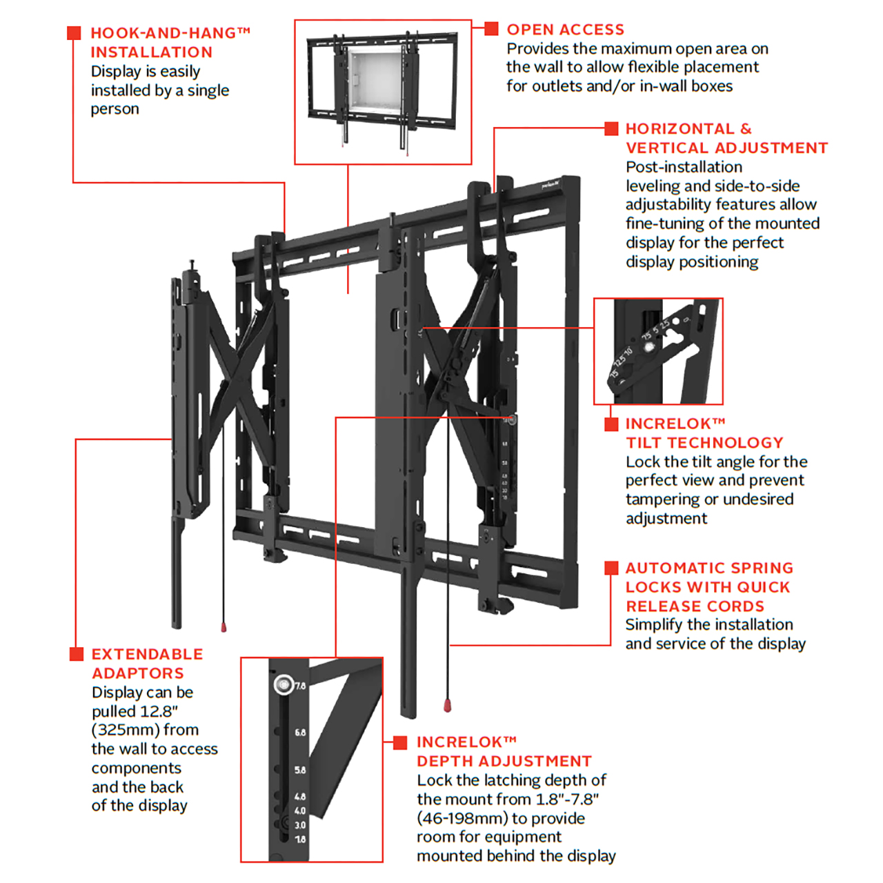 With its Hook-and-Hang™ feature, installation is quick and simple, while the open access design offers maximum wall space flexibility for outlets and in-wall boxes. Post-installation leveling and side-to-side adjustability ensure the display is perfectly aligned in any corporate, digital signage, or hospitality environment.