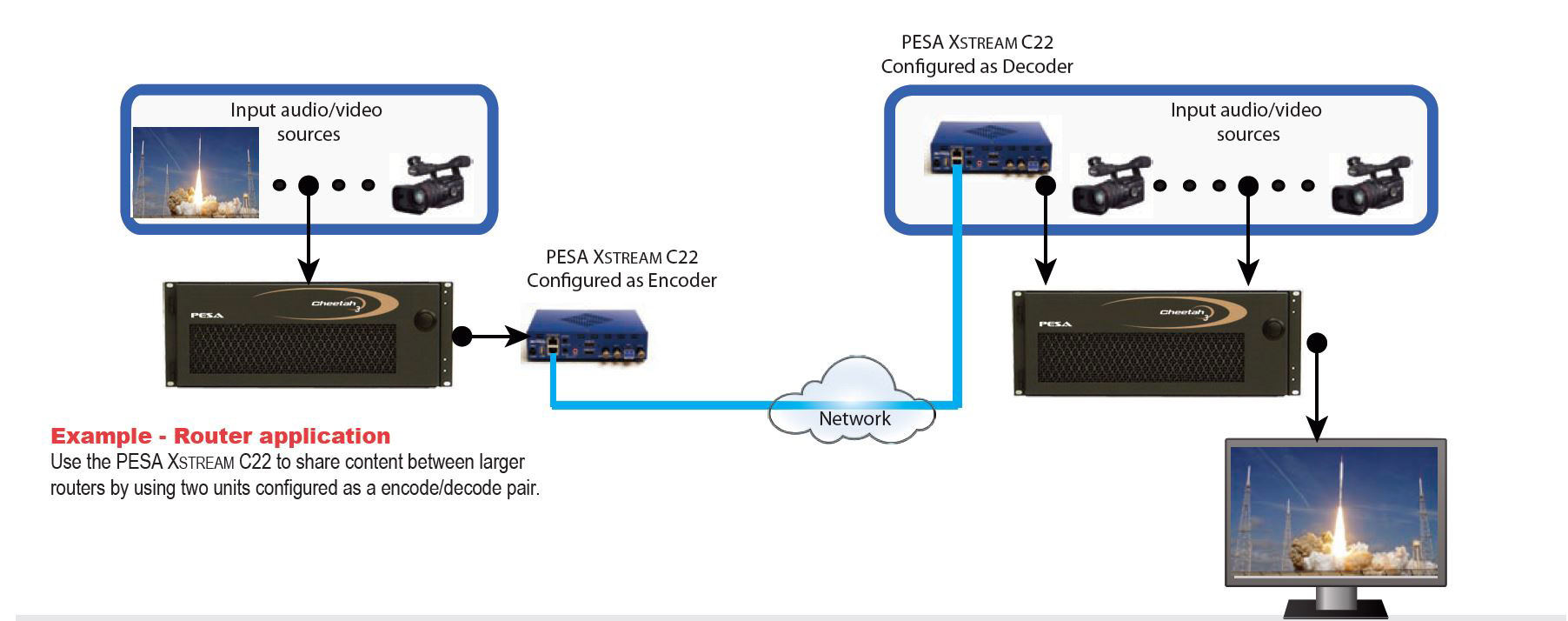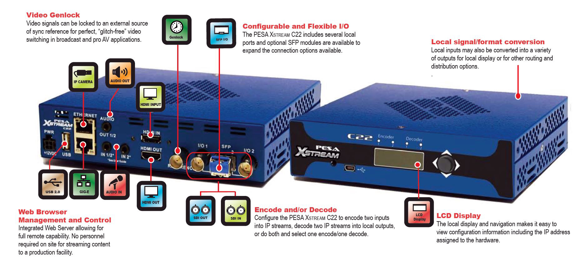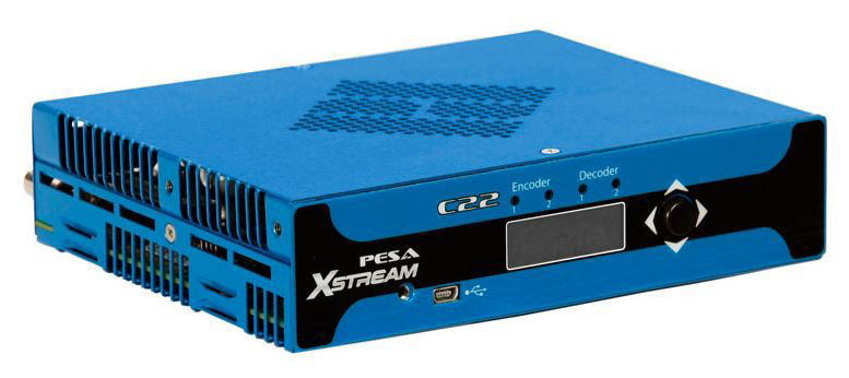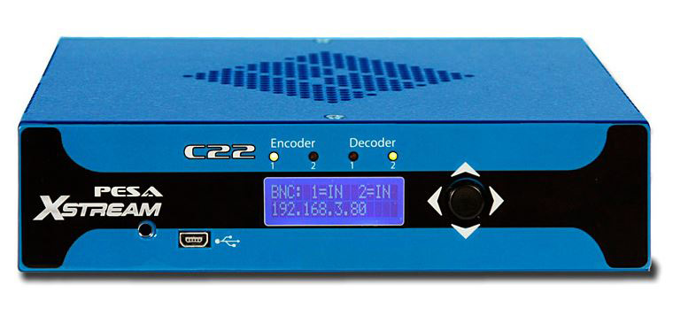 PESA's XSTREAM C22 is a highly versatile, dual channel encoder/decoder device for high definition video processing, audio processing and IP streaming. Each processing channel is totally independent from the other and can function as a remote client for decoding an H.264 IP stream or an encoder to broadcast an IP output stream from a variety of input signal sources.