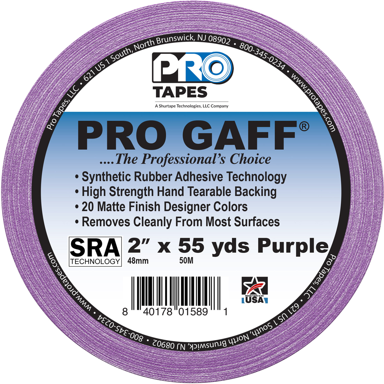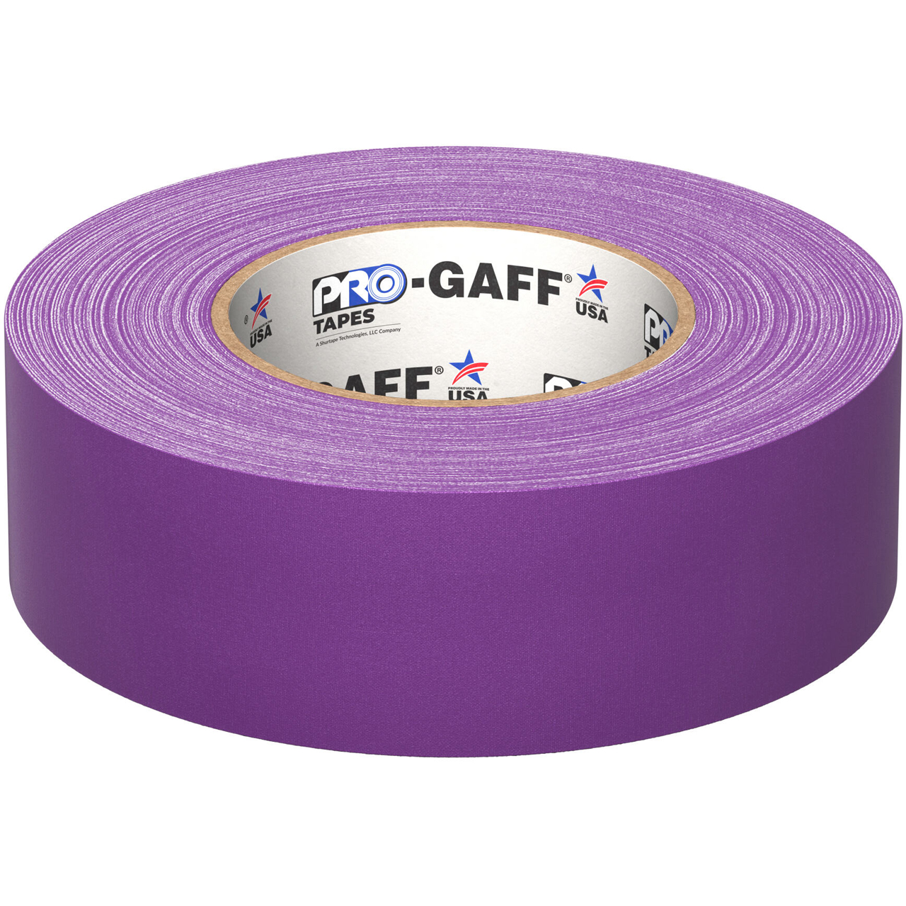 The Pro Tapes 001UPCG255MPUR Pro Gaff Gaffer Tape is a matte cloth tape with a synthetic rubber adhesive system (SRA). Available in 21 colors, making it easy to match any carpet, flooring, or equipment. Featuring 5 high visibility, UV-reactive fluorescent colors, as well as Chroma Green for color keying. Easy to tear by hand and writeable with pens and markers. Pro Gaff contains ZERO polyvinyl chloride (PVC), making it a great alternative to similar PVC coated cloths or vinyl film tapes.
