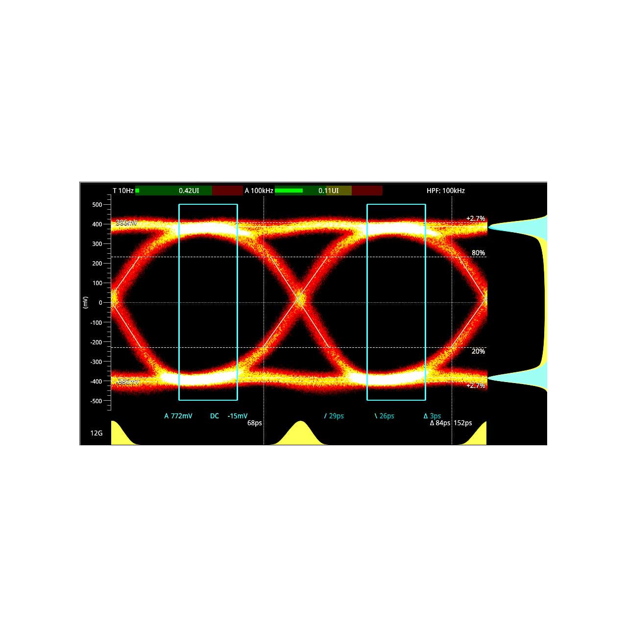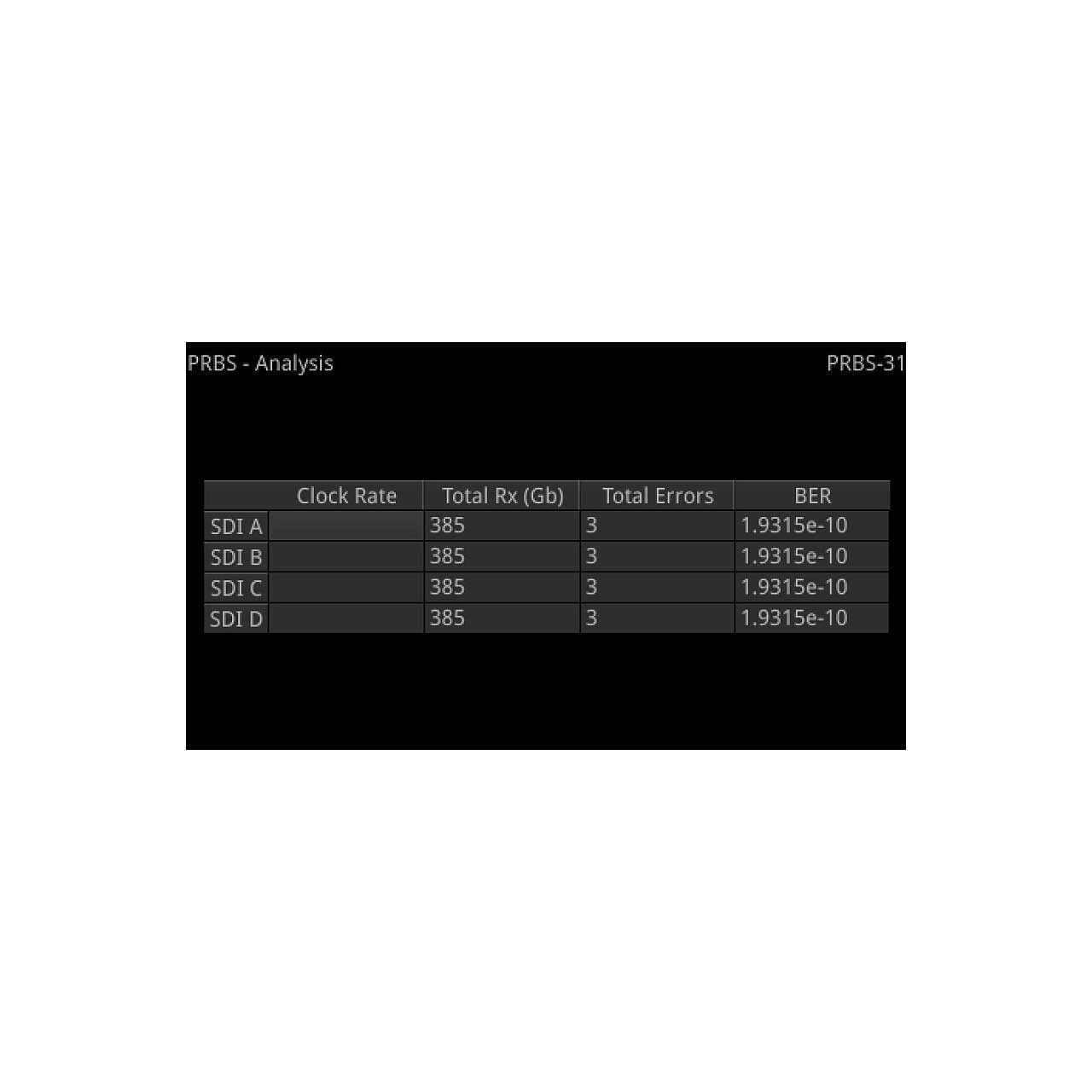 The advanced SDI-STRESS option is available for stress testing and R&D evaluations of SDI interfaces up to 12G. A comprehensive API is included for rapid automation testing. The option includes the ability under automation control to insert up to 128UI peak to peak SDI clock jitter from 10Hz to 10MHz, mute any of the SDI outputs, and control the SDI scrambler, sync-bit insertion, pre-emphasis, rise time and driver amplitude. The SDI-STRESS Eye amplitude measurement provides both Shorth Mean or Mode, with a histogram overlay and a user-defined window for the exploration of eye amplitude. Pseudo-Random Binary Sequence (PRBS) generation and analysis of PRBS-7, 9, 15, 23, 31 allows for deterministic measurement of link Bit Error Rates (BER).