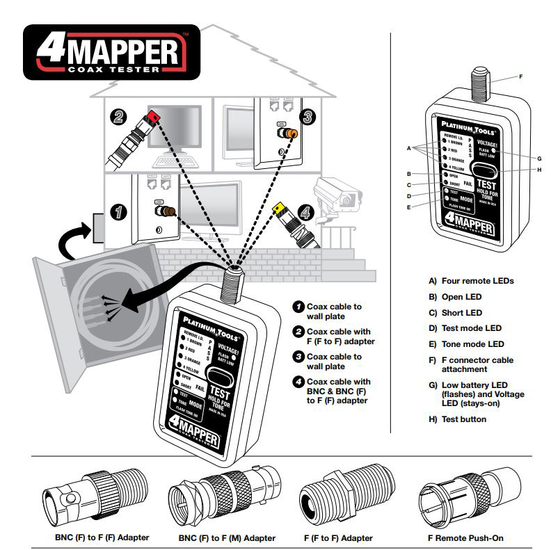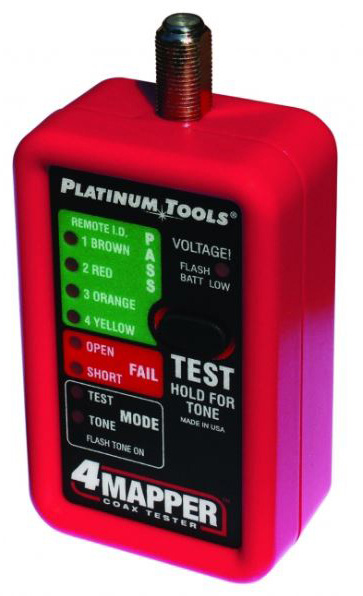 The Platinum Tools T104C 4Mapper Coax Tester is the easy and quick solution to troubleshoot and identify multiple coax cables. Fast and easy to use, the individually identified custom remotes allow you to track up to 4 connections at a time from the main cable box.