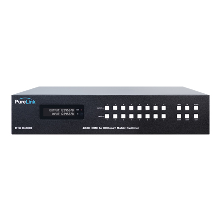 The HDTools™ HTX III-8800 provides matrix switching and extension up to 150 meters (492 feet) of (8) Ultra HD/4K sources via HDBaseT™ (with HTX III-RX receivers, sold separately). Each HDBaseT output includes a mirrored local HDMI output on the matrix. The HTX III-8800 also features de-embedding of balanced stereo analog audio and SPDIF on the switch for each output, and unbalanced stereo analog de-embedding on each Receiver.