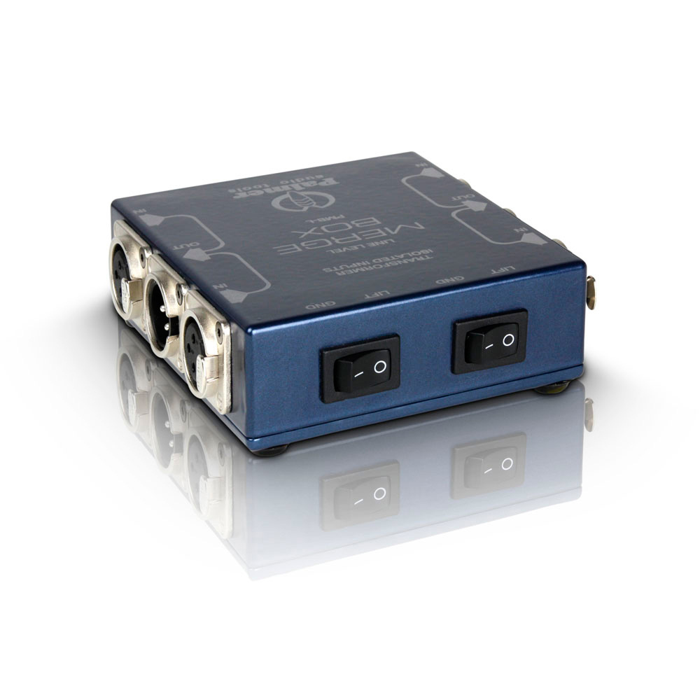 The PMBL is a 2 channel passive line level merge box. Each channel has 2 balanced XLR/f inputs. The input signal is merged via a resistor network to a XLR/m output.The top side input is transformer isolated. Possible applications might be the routing of two mixing desks to one power amp or mixing a stereo signal down to mono. Our transformer technology allows for an unbalanced top side input to be sent out balanced.