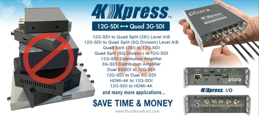 The Plura 4K Xpress is a highly flexible multi-format and multi protocol video processing unit. The standard base unit is a bidirectional Quad 3G-SDI to 12G-SDI converter, however, the addition of software licenses open the unit to further functionality as a distribution amplifier, up/down converter and a multiviewer delivering extreme flexibility to any studio environment.