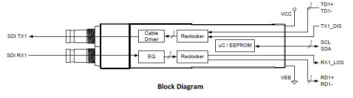 The SFP-3G-TXRX-HD-BF-LR-C is an electrical SFP Transceiver module with reclockers designed to transmit and receive SDI signals up to 2.97Gbps over 75 Ohm coaxial cables via HD-BNC Mini connectors. Cable Driver slew rate is automatically configured in order to achieve compliance to SMPTE 424M/ SMPTE 292M and SMPTE 259M. Equalizer features DC restoration to compensate for the DC content of SMPTE pathological test patterns. By suppressing accumulated jitter, each reclocker procures optimal input & output jitter performance.