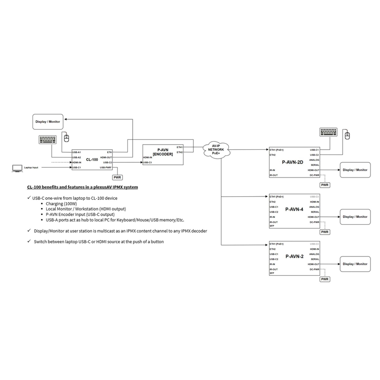 The PlexusAV P-AVN-CL100 (ChargeLink) is a durable connection hub solution engineered to provide flexible source selection and one-cable simplicity for modern AV systems. ChargeLink supports one-cable USB-C input with video, data, ethernet, and up to 100W of power delivery, enabling a single cable connection for high-performance laptops and mobile devices. Front-panel push-button switching allows users to easily select between USB-C and HDMI sources, while LED indicators provide clear system status at a glance. Professional connectivity continues on the rear panel with a full-size HDMI output, locking USB-C power input, and an ETH-BRIDGE RJ45 port for IT and network integration. An included universal power supply (100V - 240V, 50-60Hz, 1.9A) and rugged chassis design ensure dependable performance across corporate, education, healthcare, broadcast, and AV-over-IP deployments.