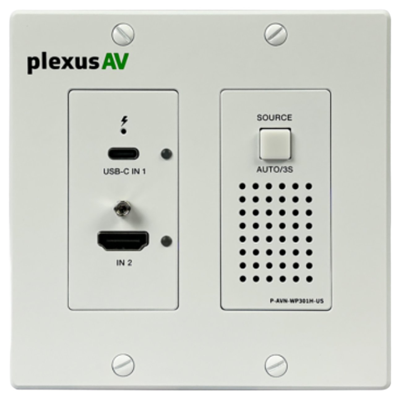 The PlexusAV P-AVN-WP301H-US-W is a HDBaseT wall plate that delivers a seamless connectivity experience with both a full-sized HDMI input (with locking connector), versatile USB-C input, and intelligent input auto-switching. This USB-C input supports up to 60W charging (when powered), ethernet connectivity, and reliable performance with active cooling. Built on HDBaseT 3.0 technology, it extends uncompressed, zero-latency video without relying on IP compression, ensuring pristine image quality. Designed in a sleek Decora-style form factor (available in both US and EU/UK-W sizes) with black or white color options, the wall plate integrates effortlessly into any room design. Optimized for the PlexusAV P-AVN-3-HDBT IPMX gateway transceiver, yet fully compatible with other HDBaseT 3.0 devices, this wall plate is a future-ready solution for professional AV installations.