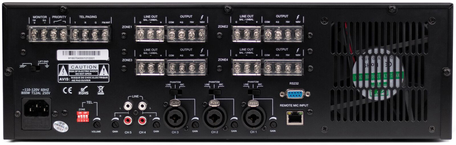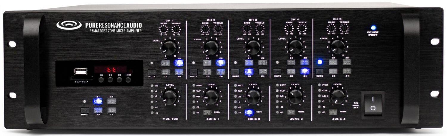 The Pure Resonance Audio RZMA120BT is a 4 zone commercial mixer amplifier equipped with built-in MP3, FM tuner, Bluetooth and recording capability. This multi-zone mixer amplifier has 4 x 120-watt output capability at 4 Ohm, 70 and 100 Volts. Advanced matrix technology allows four zone selectable inputs to be assigned to a zone, or across multiple zones with the push of a button. A monitor channel provides a 1 watt 8-ohm output for a control room monitor speaker. Remote microphones can be daisy-chained via Cat5 for zone paging, and a convenient IR remote is available for volume and source control.