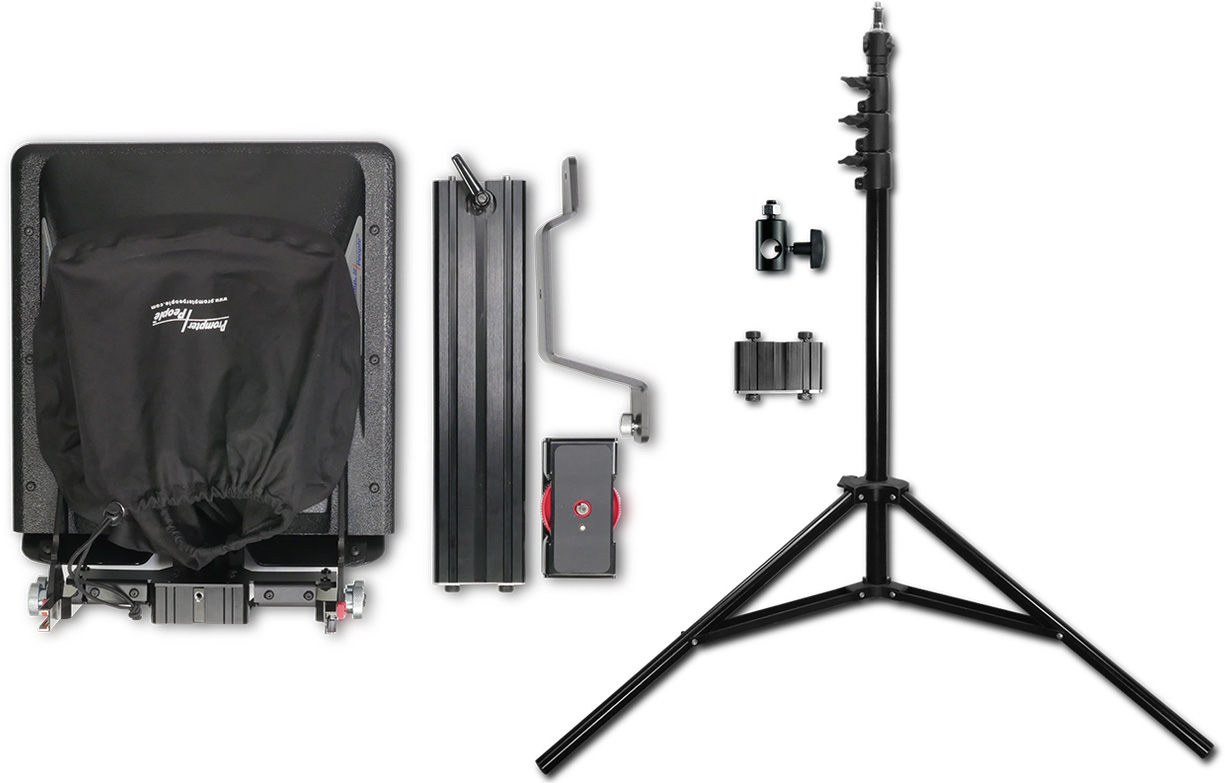 The Proline iPAD teleprompter's patent-pending design utilizes custom aluminum extrusions for high strength, featuring lightweight and tool-less setup and operation. The unique design offers perfect balance for any size camera - from a palmcorder to a full size ENG camera. The universal iPAD bracket fits all models of iPADs and many Droid tablets. The Flex iPAD teleprompter can be quickly and cost effectively converted to an iPad or to a 12, 17, 19, or 24 inch prompter for ultimate flexibility.