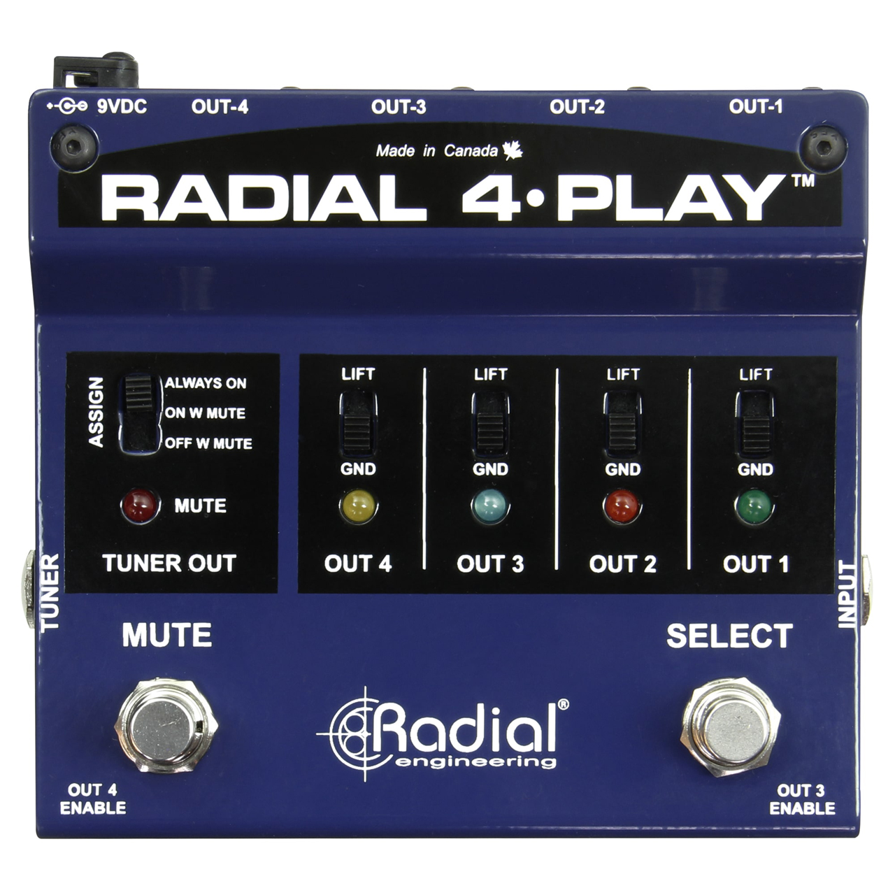 The Radial Engineering 4-Play is a DI box specifically designed for multi-instrumentalists, providing the ability to quickly and silently change instruments on stage. With four balanced outputs, each instrument has its own channel in the PA and monitors. Many performing multi-instrumentalists will have each of their instruments feed a separate channel in the PA system, allowing for individual level, EQ, and effects settings. Typically this would require multiple DI boxes and instrument cables, creating a mess on stage that can be difficult to manage. With the 4-Play, you only need to connect one cable to the input of the pedal, and it provides you with four DI outputs to feed the PA system. Not only does this mean fewer cables on stage and less devices to keep track of, but it also eliminates the need to flag down the sound engineer when you need to switch instruments during a performance. The 4-Play puts you in control, while streamlining your setup on stage.