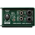 The passive design begins with 100% discrete components throughout. A set & forget level control lets you attenuate the input signal to prevent it from overloading the destination device. Output connections include a stereo pair of ¬" connectors, a set of RCAs and a mini 3.5mm (1/8") for interfacing to a mini recorder or lap-top computer. Transformer isolation helps eliminate hum and buzz caused by ground loops while eliminating stray DC currents from flowing.