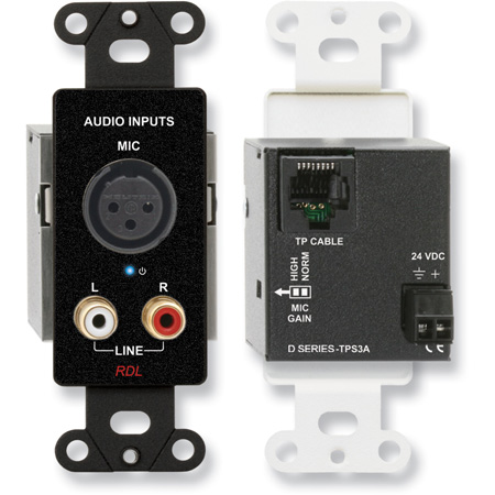 The D SERIES-TPS3A modules are three-pair audio sending modules compatible with RDL Format-A twisted pair products. These modules are designed to be mounted in wall boxes, cabinets or other enclosures that allow users to connect audio sources. The -TPS3A models mount in RDL WB-1U and WB-2U wall boxes, or in standard U.S. electrical boxes. The D-TPS3A features a white front-panel laminate with gray lettering that matches RDL Decora-style remote controls. The DB-TPS3A features a black front-panel laminate. The DS-TPS3A is constructed of stainless steel to coordinate with RDL Decora-style stainless steel remote controls in commercial/industrial installations. APPLICATION: The D SERIES-TPS3A modules features an XLR microphone input and two RCA phono jack inputs, one for the left channel source and one for the right channel source. The unbalanced inputs are designed to receive standard -10 dBV consumer level signals. The microphone input provides 24 Vdc IEC phantom voltage and accepts both dynamic and condenser microphone signals. The input signals are amplified using studio-quality preamplifiers optimized for normal operating levels. A rear-panel GAIN switch is provided to set the amplification of the microphone preamplifier. This switch is normally set by the installer for NORM (normal) gain. If consistently low mic levels are expected, this switch may be set to the HIGH gain position. The pre-amplified microphone source is routed to pair A. The buffered left and right line-level inputs are routed to output cable pairs B and C. These modules drive all three FORMAT-A cable pairs, so they are not equipped to receive inputs from other sender modules. The D SERIES-TPS3A may not be connected together with any other sending modules. The D SERIES-TPS3A may be powered directly from a 24 Vdc power supply using the rear-panel detachable terminal block. Local power connected to the module is also fed to all connected remote modules. The -TPS3A may be remotely powered through the twisted pair cable from any other module, signal distributor or RDL power inserter connected to the same twisted pair cable. Module power is indicated by a front-panel LED. RDL FORMAT-A features superior audio performance that rivals or exceeds shielded wiring. Design simplicity, ease of installation, unsurpassed flexibility, automatic fused power, exceptional hum rejection, low noise, and low distortion provide designers and installers the optimum choice in economical twisted pair products.