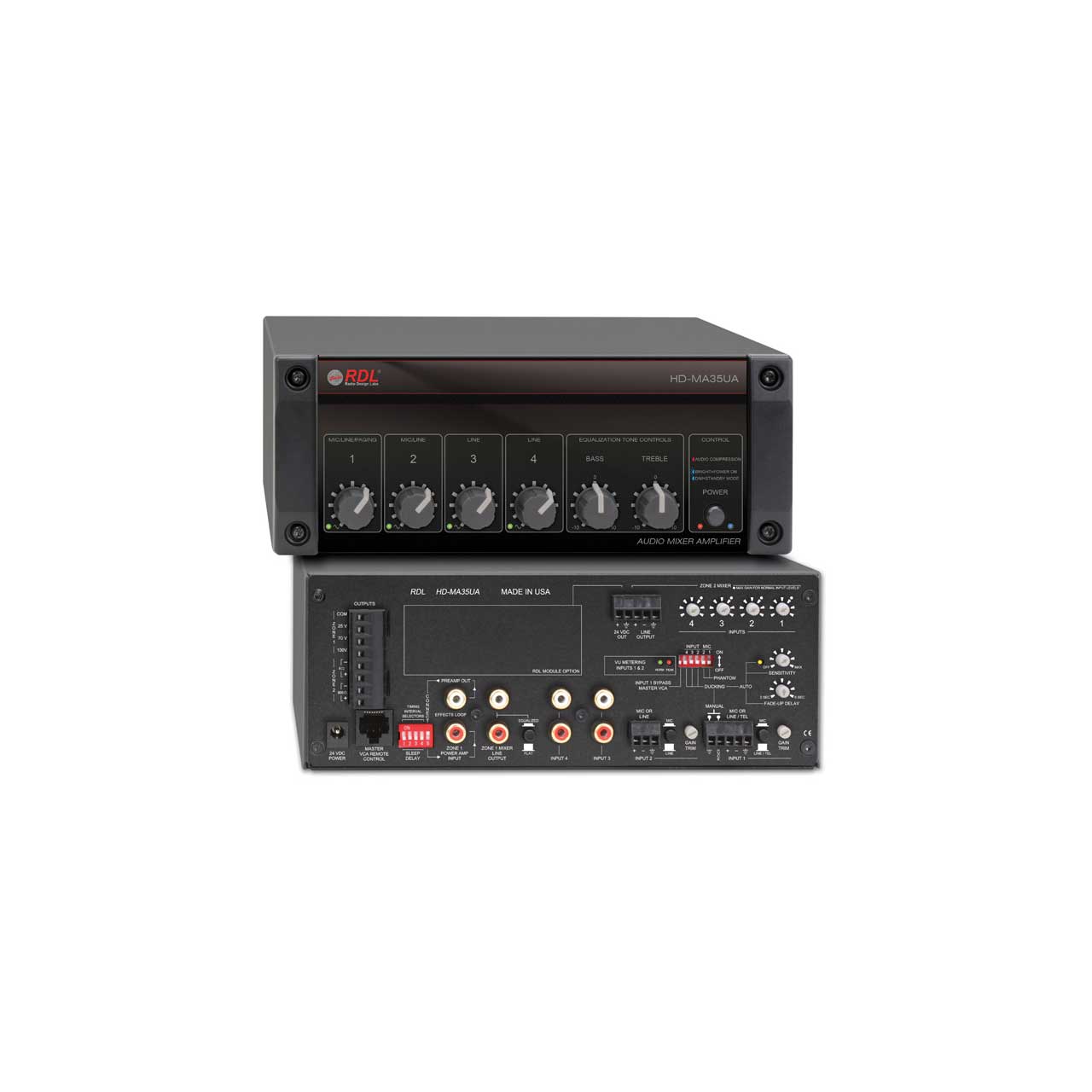The HD-MA35UA is a four input audio mixer amplifier for systems demanding the broadest range of features and the highest energy efficiency. Two output power amplifier zones, 35 watts (Zone 1) and 4 watts (Zone 2), are driven from high-efficiency Class D amplifier stages. The mixer and amplifier sections all normally shut down (standby "sleep" mode) when audio is absent and automatically turn on when needed. The Zone 1 amplifier output level may be VCA controlled using various optional RDL remote controls, or by industry standard 0 to 10 Vdc or 0 to 10k ohm controls. This output provides a constant voltage output (25 V, 70 V or 100 V). The Zone 2 amplifier output drives an 8 ohm speaker and/or 600 ohm telephone equipment.