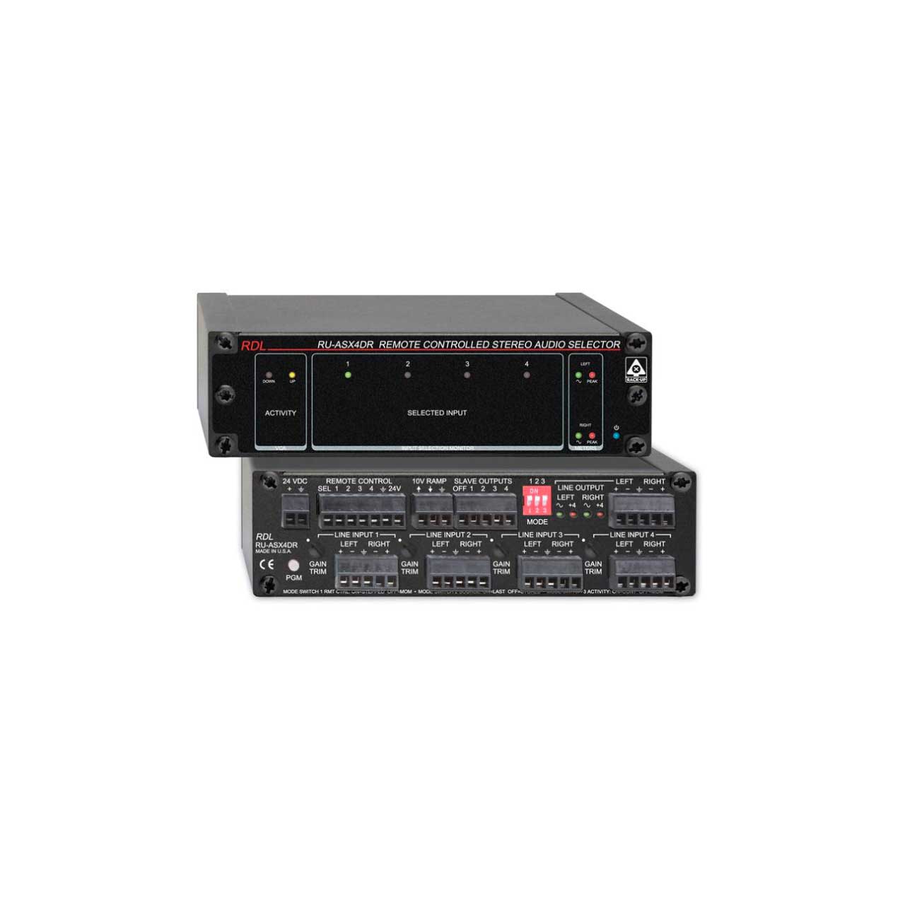 Inputs are selected by a sequential remote control such as an RDL D-RCS4, by a momentary remote control such as an RDL D-RC4M or by an external open-collector momentary closure to ground. The RU-ASX4DR may be remote controlled from a single or from multiple locations. When a source is selected, the RU-ASX4DR provides a 25 mA open-collector output to control other equipment or modules. A front-panel LED indicates the selected source. Only one source may be selected at a time. If the momentary input terminal for a selected source is triggered again, all inputs are turned off.