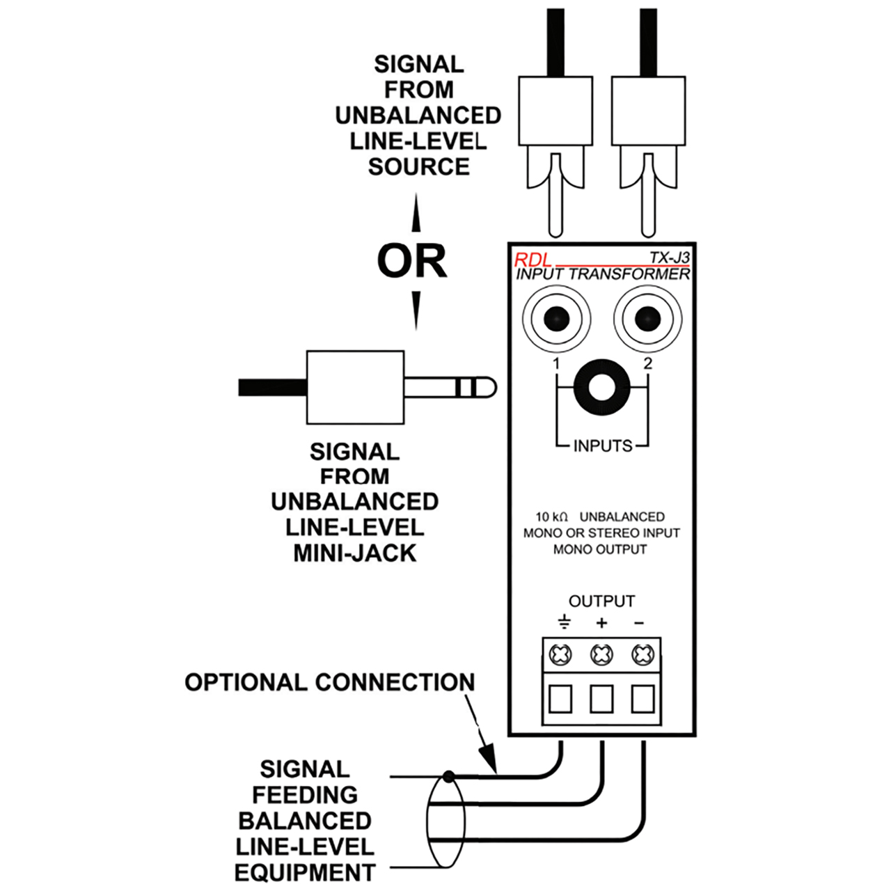 The TX-J3 is a complete unbalanced line-level audio input module. The front panel features two gold plated phono jacks and a Mini-jack input, intended for mono or stereo consumer-level sources. When a Mini-jack is plugged into the TX-J3, the RCA input jacks are disabled. Inputs 1 and 2 (Mini-jack L and R) are combined and balanced through audio transformers, configured to reject induced hum. The line-level output is provided on the front-panel detachable terminal block for connection to 10kΩ or higher input impedance line-level module or equipment inputs.