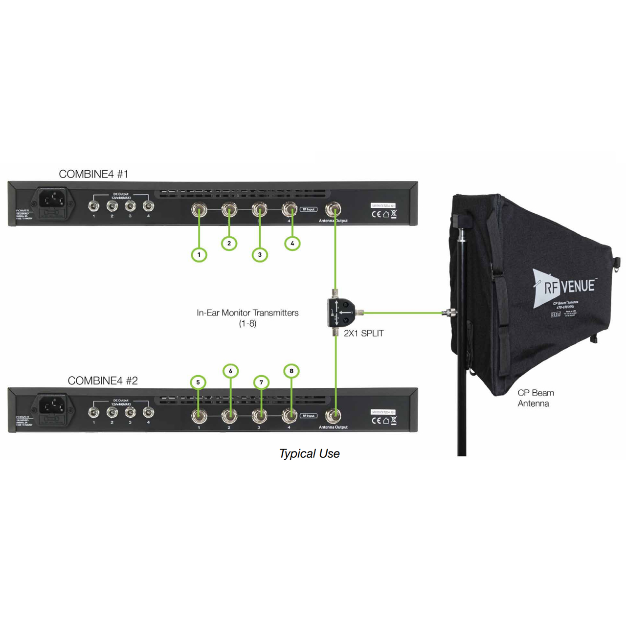 The RF Venue 2x1SPLIT is intended for use with wireless audio systems and is compatible with all major brand wireless microphones and in-ear monitors.