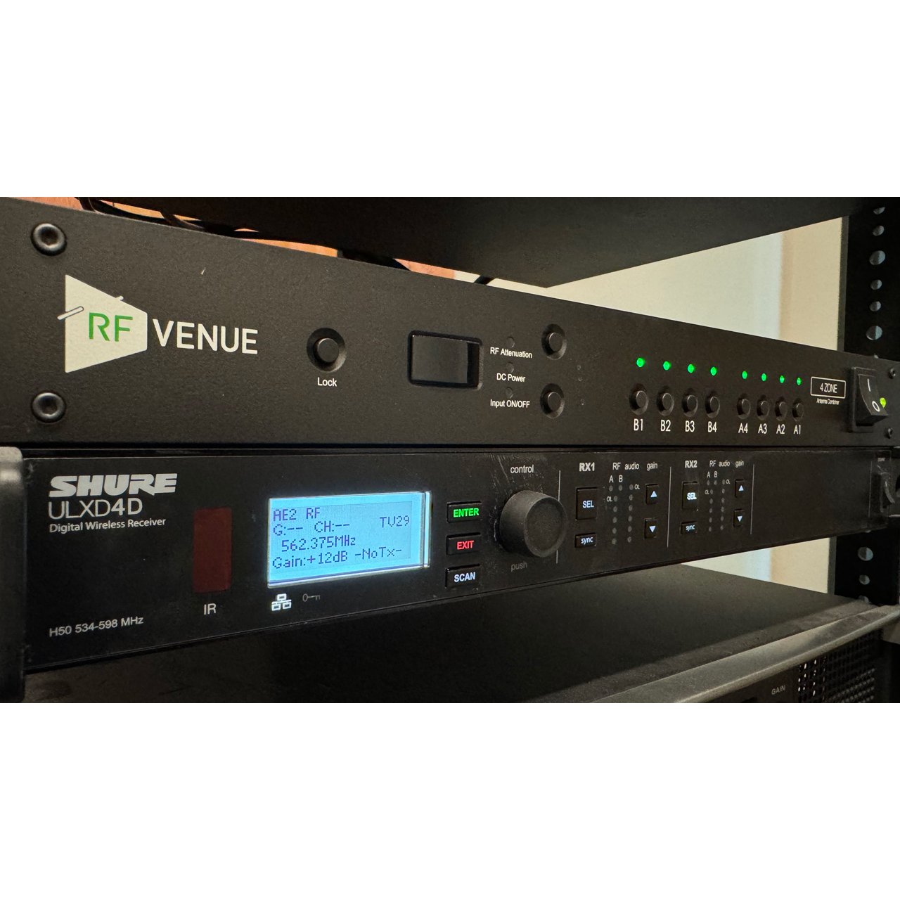 When used in conjunction with up to four Diversity Fin Antennas and one or more DISTRO4 antenna distributors, 4 ZONE completes a turnkey package for any multi-zone wireless microphone project.