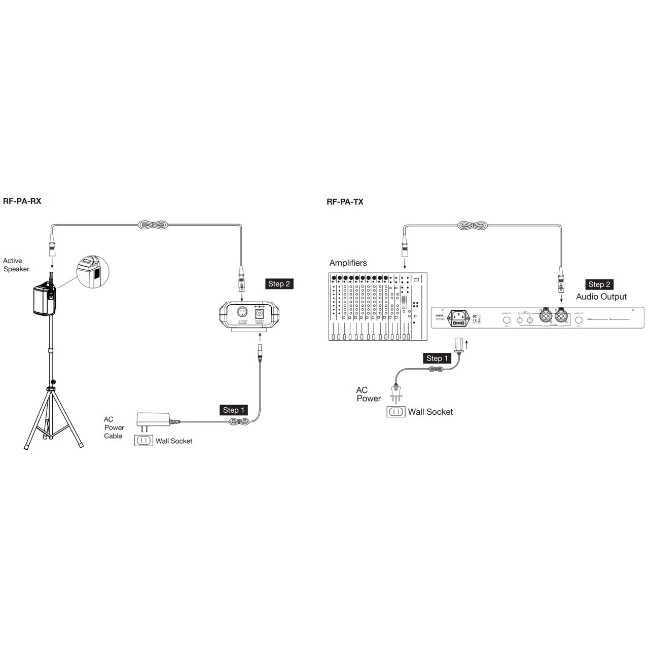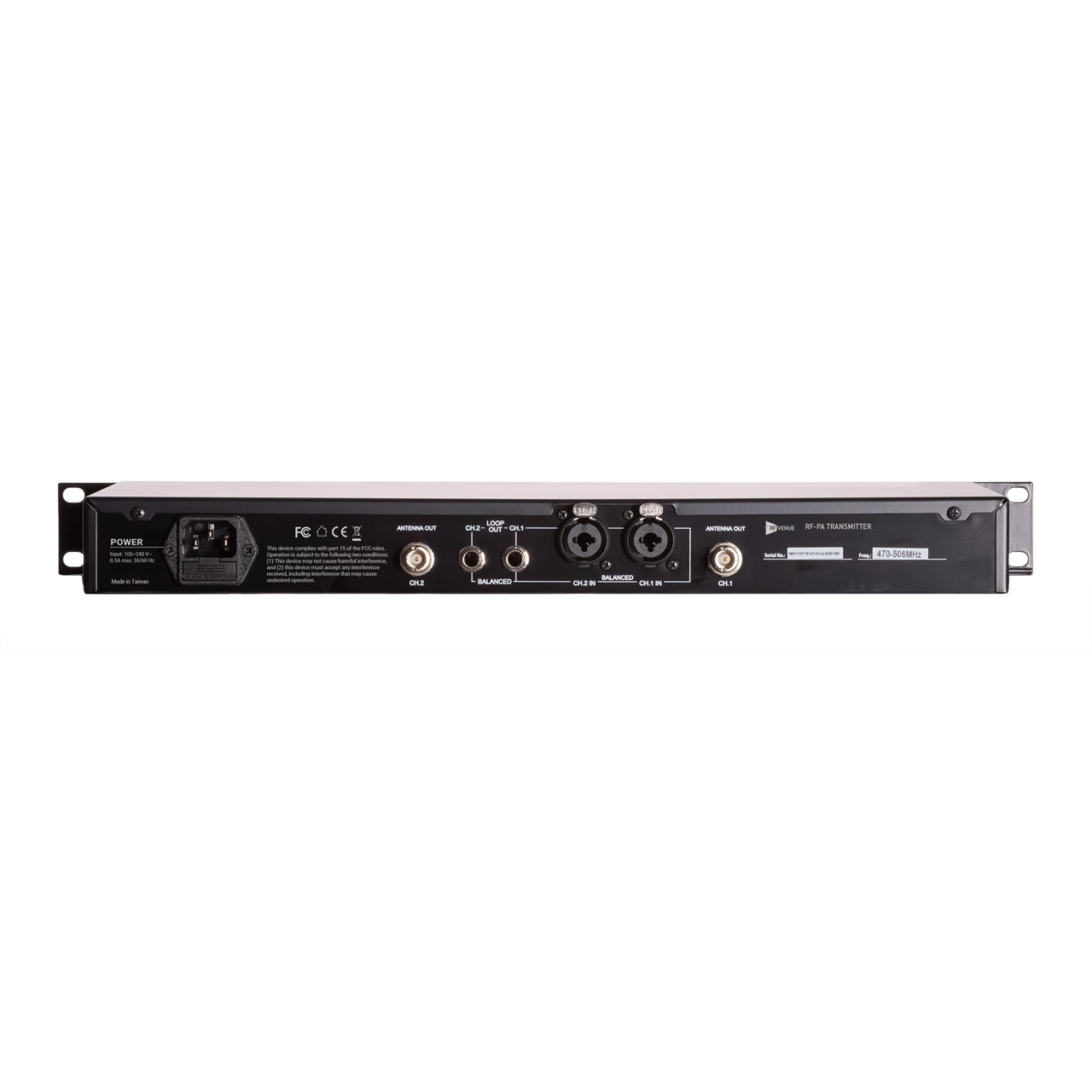 The RF Venue RF-PA-8PACK includes 8x receivers and the RF PA rackmounted transmitter. 8 receivers allows up to four stereo pairs for delay tower PA systems in large areas, or eight mono speaker drops anywhere within range of the transmitter's UHF RF link.