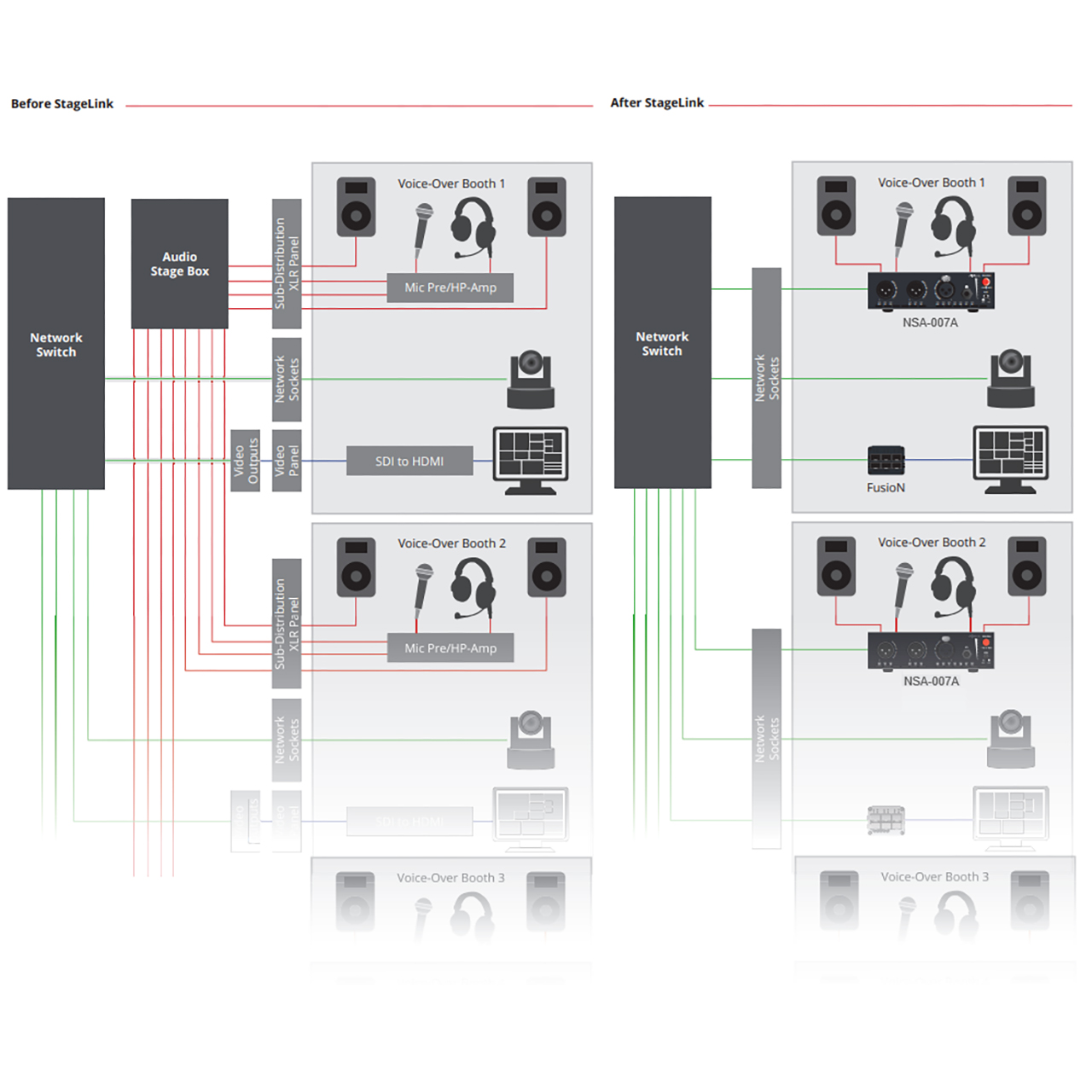 The first generation of StageLink edge devices is designed to enhance IP-based audio and intercom workflows with unparalleled flexibility, reliability, and advanced features tailored to the requirements of broadcast, live event, and studio environments. Unlike traditional setups that rely on expensive and inflexible specialized cabling for each signal type, StageLink edge devices utilize standard network components to establish a decentralized network. Whether connecting microphones, intercom or GPIO devices (or any other audio-enabled device), StageLink transmits your audio and control data signals via IP and based on open standards, while eliminating the complexities of IP configurations and the hassles of analog systems.