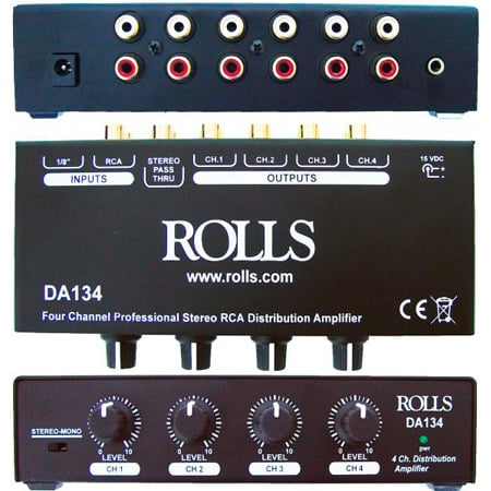 Designed for high end RCA audio distribution the Rolls DA134 is a four channel distribution amplifier. RCA and 1/8” inputs that can be switched from mono or stereo. The DA134 will distribute a mono signal to eight outputs, or a stereo signal to four stereo outputs. The outputs are designed to drive line level signals. The DA134 is the perfect distribution amp anywhere high quality sound distribution is required.