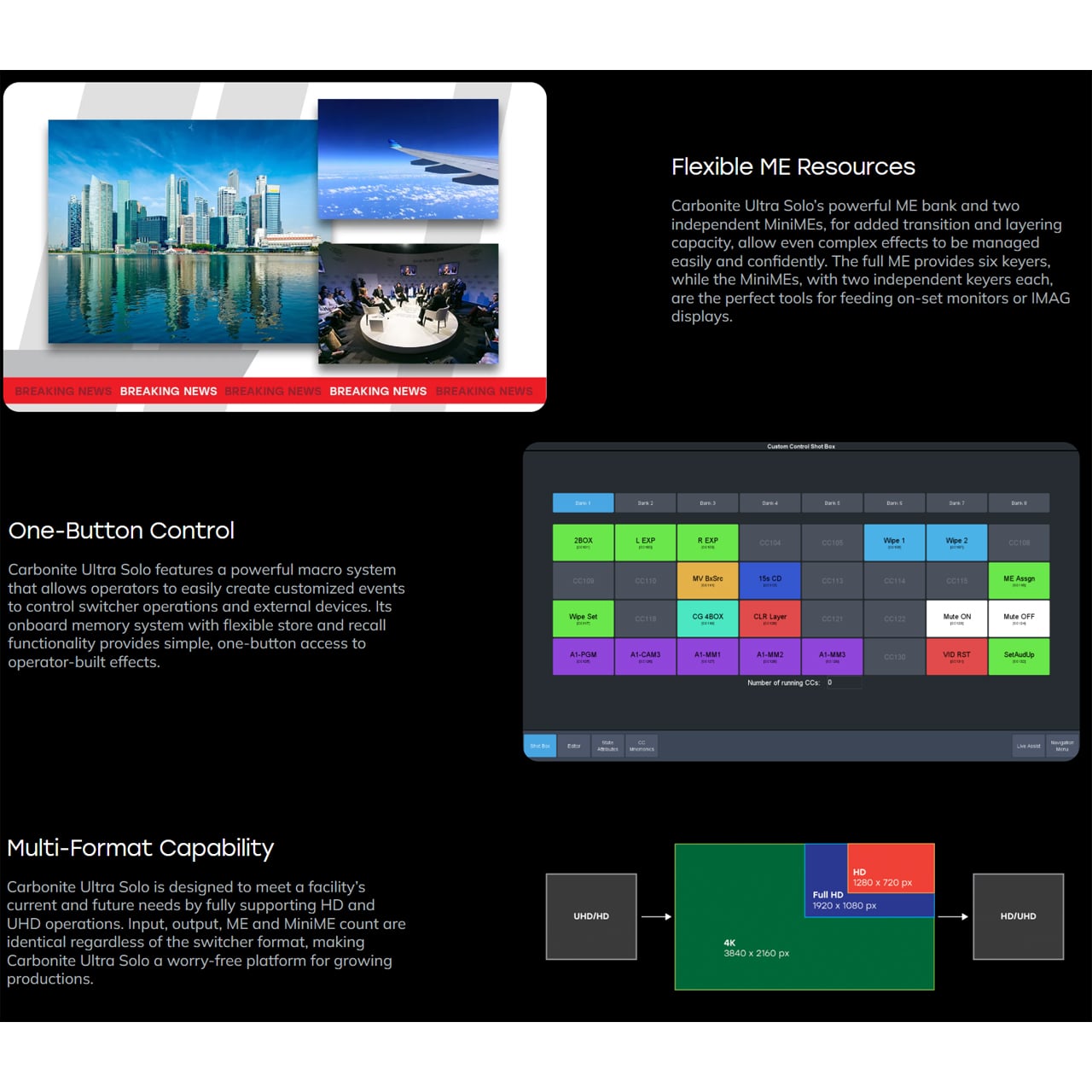 Carbonite has been the leading mid-size production switcher line for over a decade. Carbonite Ultra Solo brings this much-loved switcher's legendary performance and ease of use to the small switcher market, enabling even modest-size facilities to benefit from a tradition of excellence.
