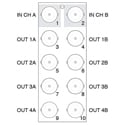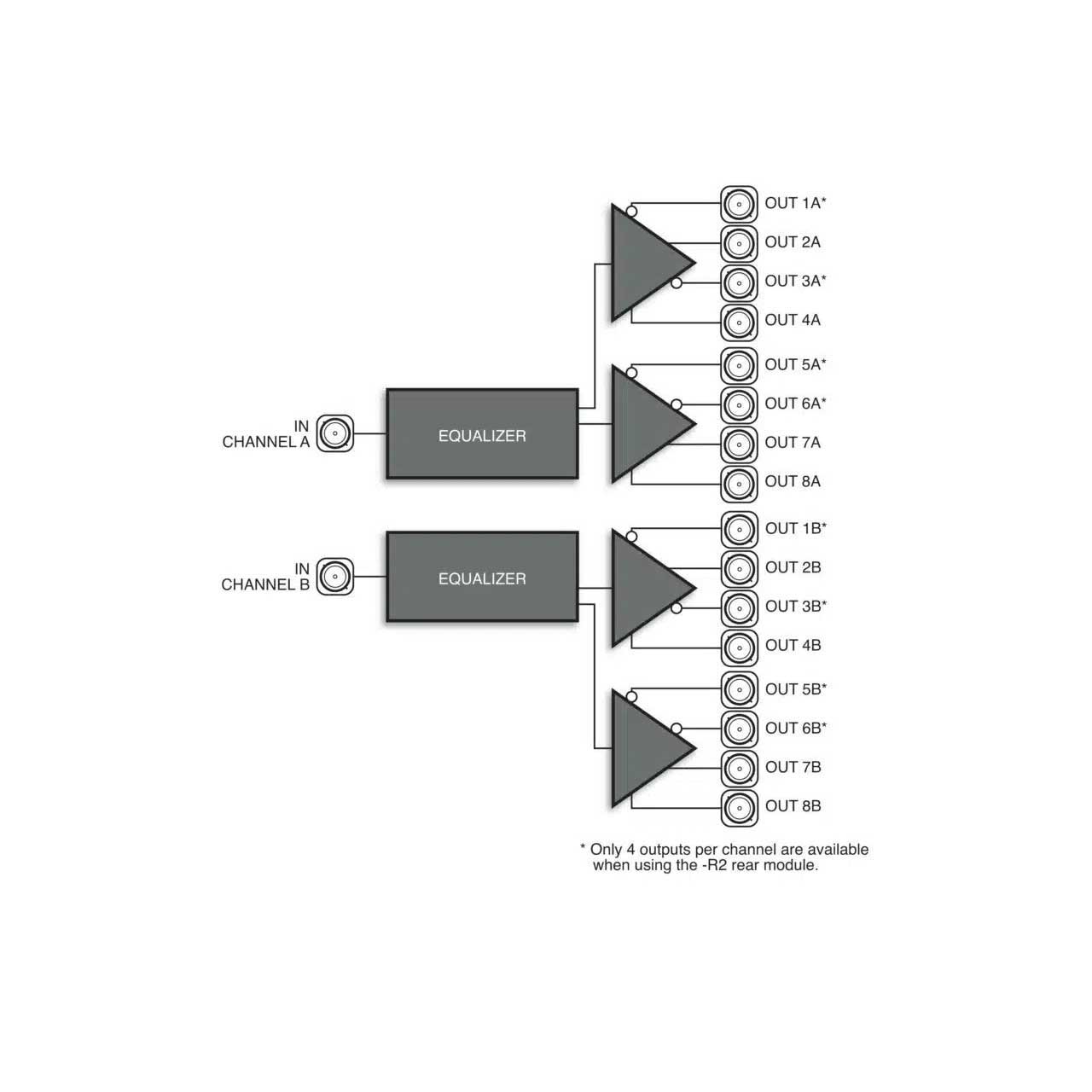 With up to 8 outputs per independent input channel, the DEA-8805 can be used in space critical environments as a dual 1x8 DA, when paired with the-R2H HD-BNC rear module. This configuration allows for up to 20 1x8 DAs in a single openGear® frame, using 10 cards. With the standard 10 BNC rear module, -R2, the DEA-8805 operates as a dual 1x4 distribution amplifier.