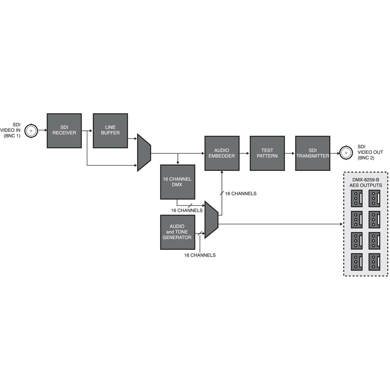 The DMX-8259-B supports full channel assignment to the discrete outputs. Various configuration options, including internally generated patterns and tones, are available for audio and video output scenarios should a loss of input occur.
