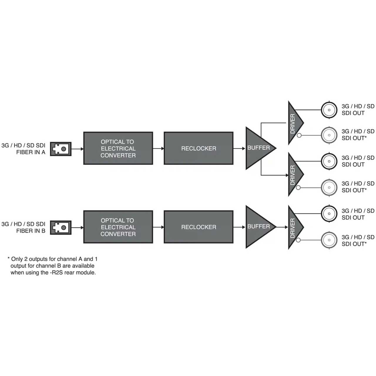 The -R2S high density split rear module can accommodate up to 2 FDR-6603 cards, maximizing the number of conversion channels in a frame. In this configuration, the OG3-FR supports up to 40 independent channel solutions, providing ultra-high density conversion in a 2RU space.
