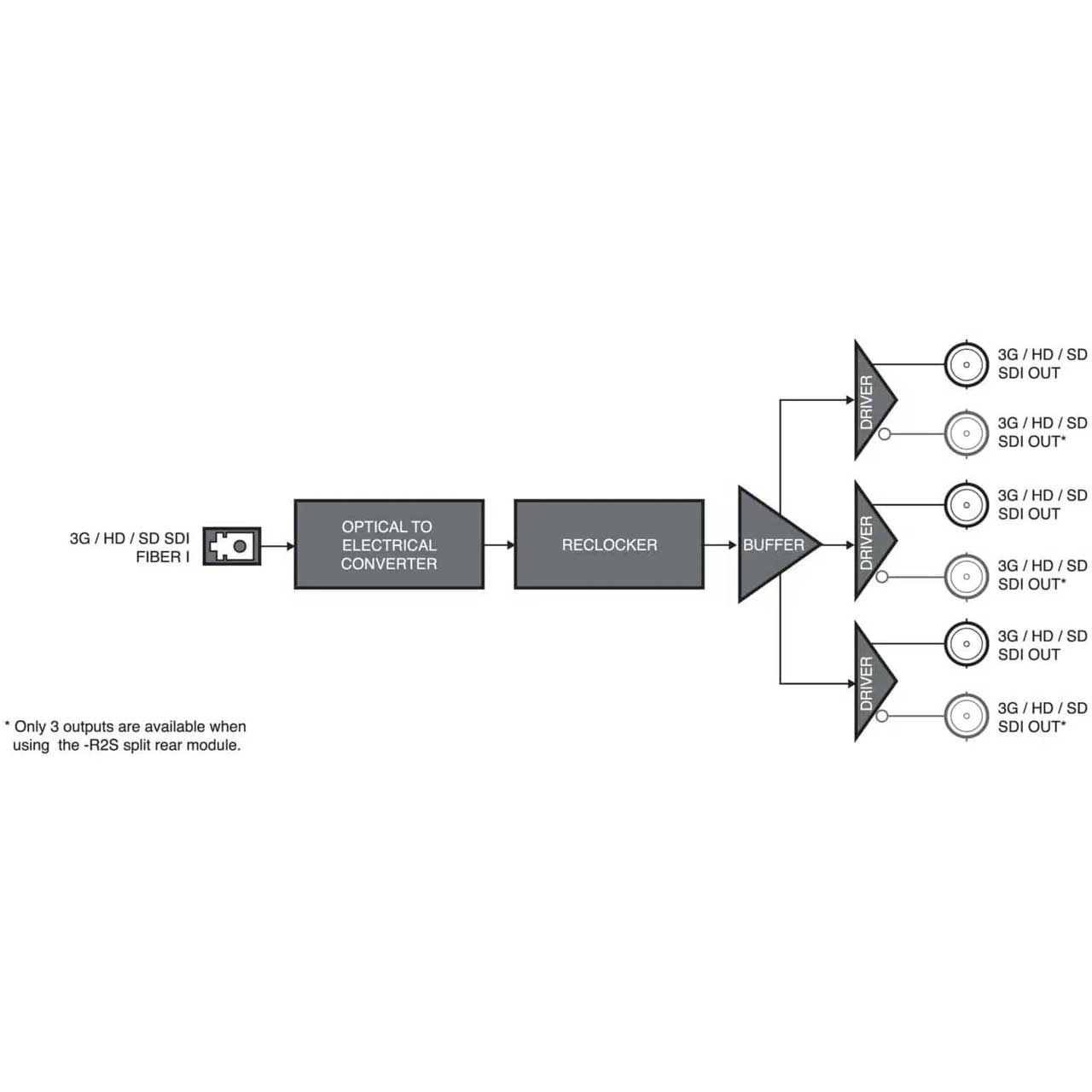 The -R2S high density split rear module can accommodate up to 2 FSR-6601 cards, maximizing the number of conversion channels in a frame. In this configuration, the OG3-FR supports up to 20 independent channel solutions.