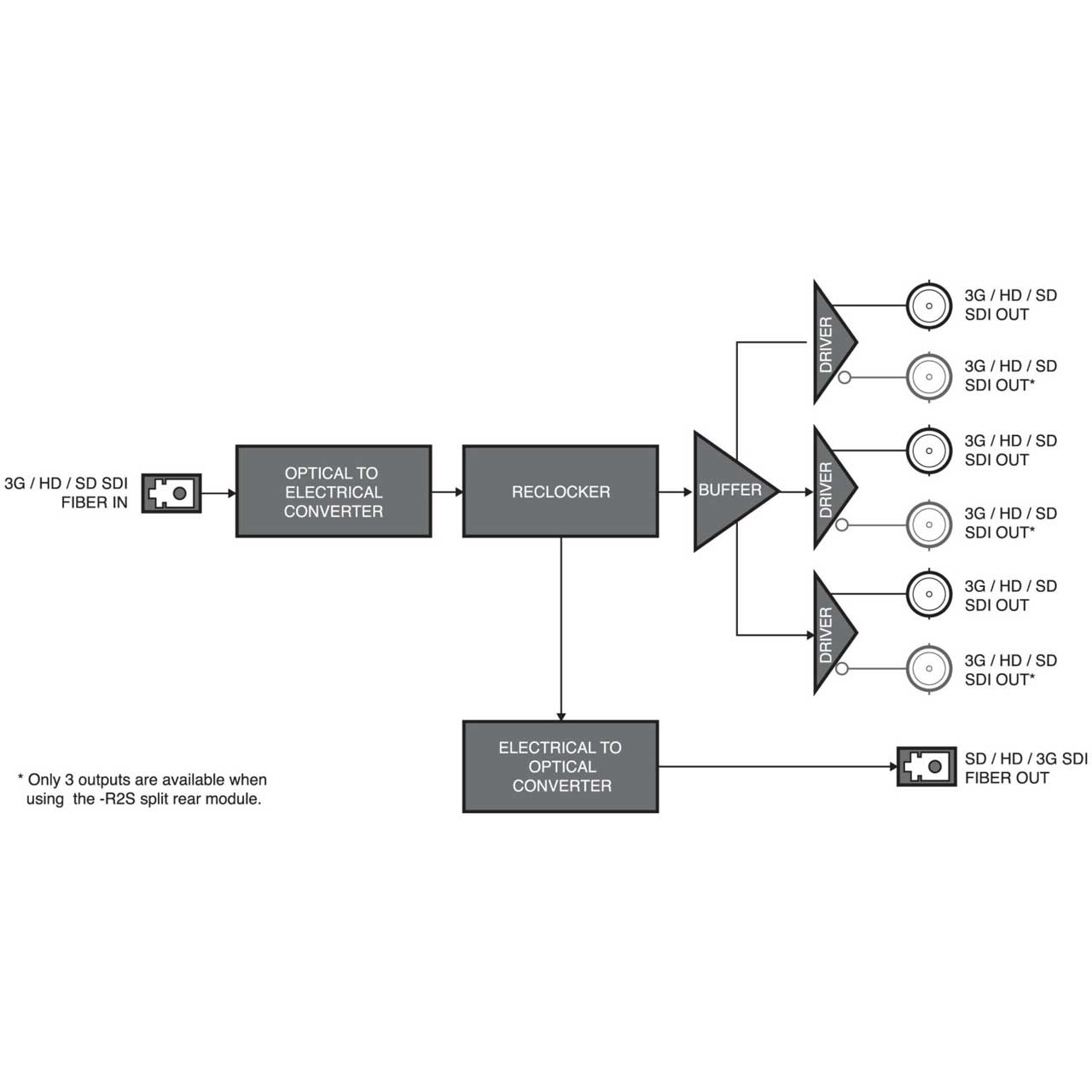 The FSR-6605 is a fiber optic receiver to serial digital SDI converter supporting serial digital data rates from 143Mb/s up to 2.97Gb/s (1080p). SDI outputs are reclocked providing excellent jitter and return loss specifications.