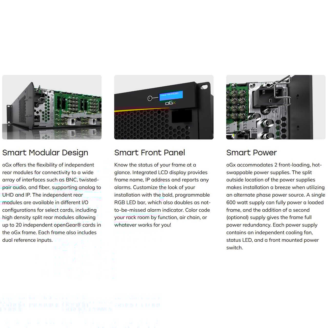 oGx offers the flexibility of independent rear modules for connectivity to a wide array of interfaces such as BNC, twisted-pair audio, and fiber, supporting analog to UHD and IP. The independent rear modules are available in different I/O configurations for select cards, including high density split rear modules allowing up to 20 independent openGear® cards in the oGx frame. Each frame also includes dual reference inputs.