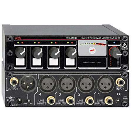 The RDL RU‑MX4L is the ideal choice in many applications where a combination of balanced and/or unbalanced line‑level signals needs to be mixed. Balanced connections use XLR connectors. Unbalanced signals are coupled through phono jacks. Each of the four RU‑MX4L inputs can accept either a balanced XLR line‑level input or an unbalanced line‑level phono jack input. The unbalanced phono jack LINE OUTPUT from one RU‑MX4L may connect to the unbalanced input of other equipment, or may be connected to the DIRECT input of another RU‑MX4L or an RU‑MX4 to expand mixing capabilities. Up to 3 RU‑MX4 type mixers may be rack mounted in a single rack unit using an RDL RU‑RA3HD rack adapter. The RU‑MX4L provides one balanced output, switchable for mic or line level. Audio levels are adjustable on the front panel. Each input channel is equipped with a front‑panel dual‑LED VU meter that follows standard VU ballistics. The final mix is displayed on an LED string VU meter featuring a visually comfortable arc motion. A factory installed output isolation transformer is available by ordering the RU‑MX4LT.